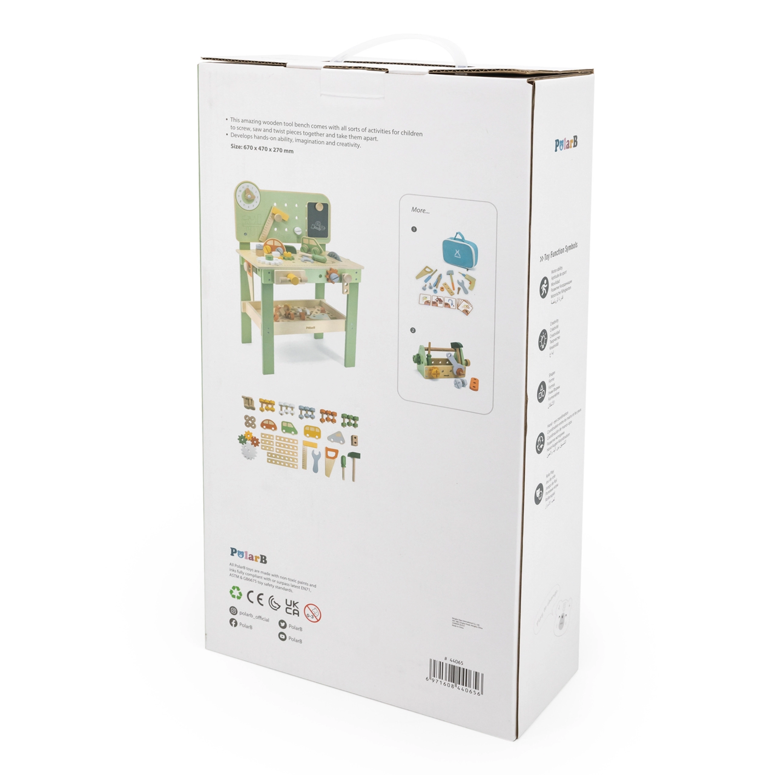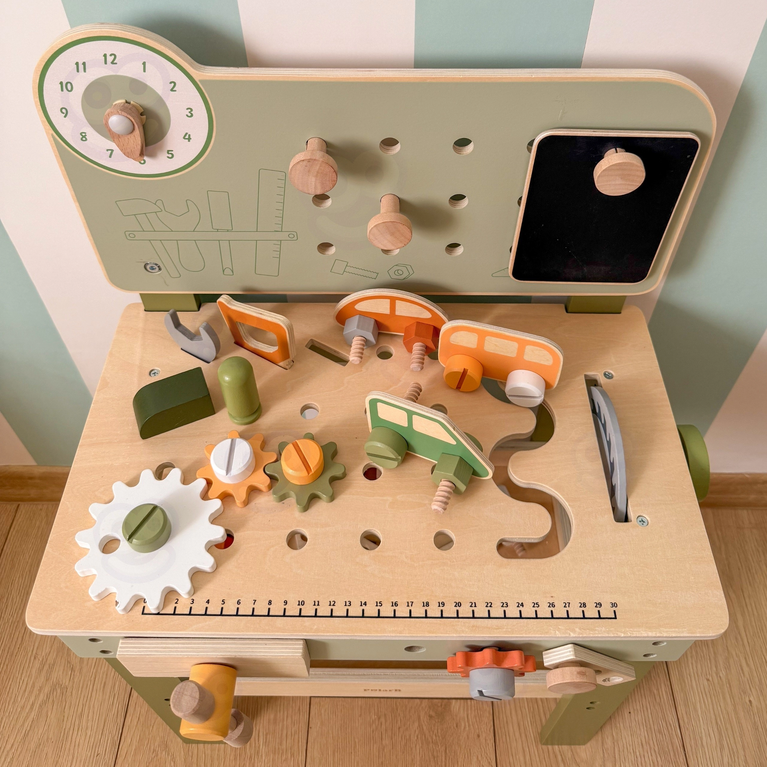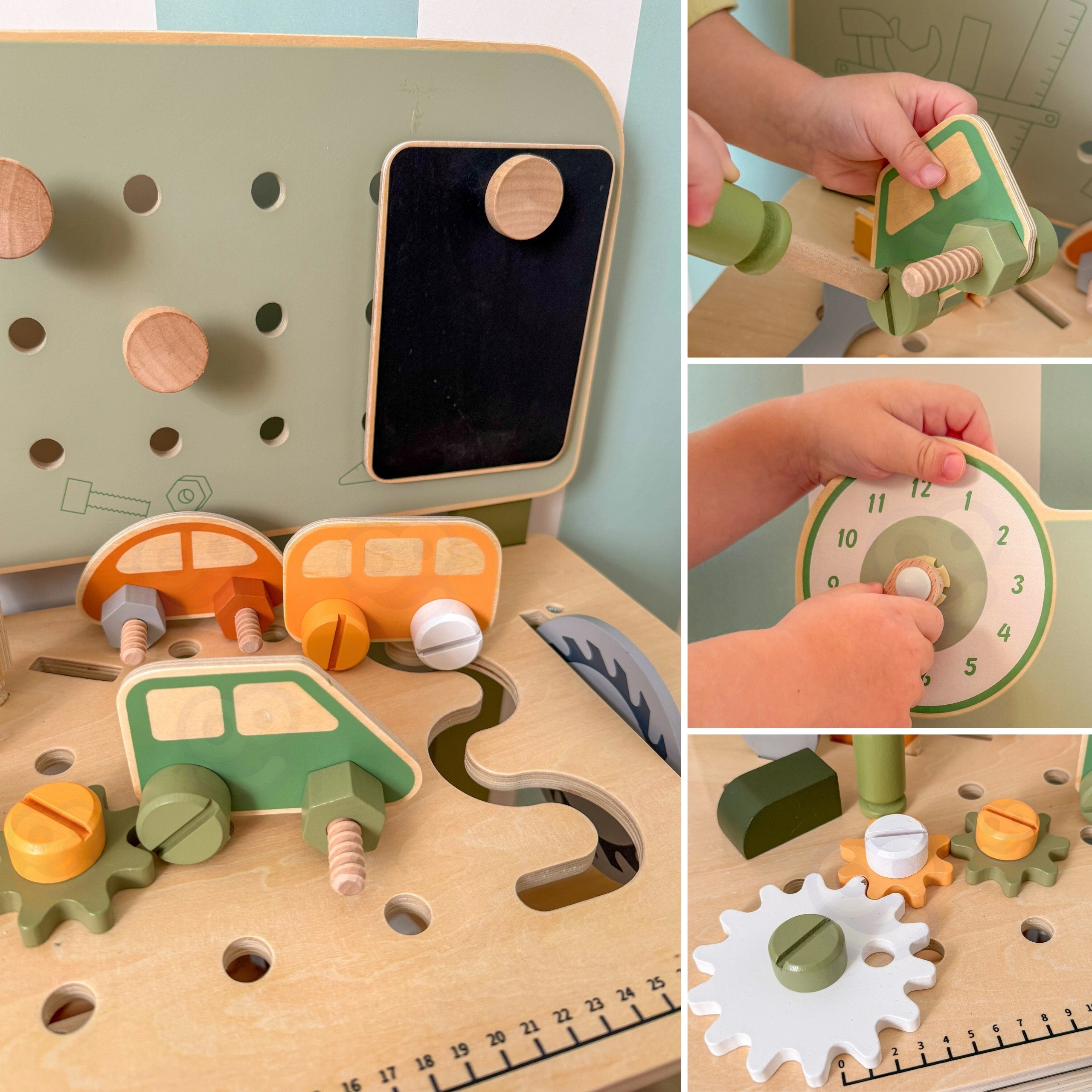 Suoliukas su perforuota lenta, matavimo skale ir besisukančiais elementais skatina realistišką žaidimą ir įgūdžių, reikalingų darbui su įrankiais, ugdymą.