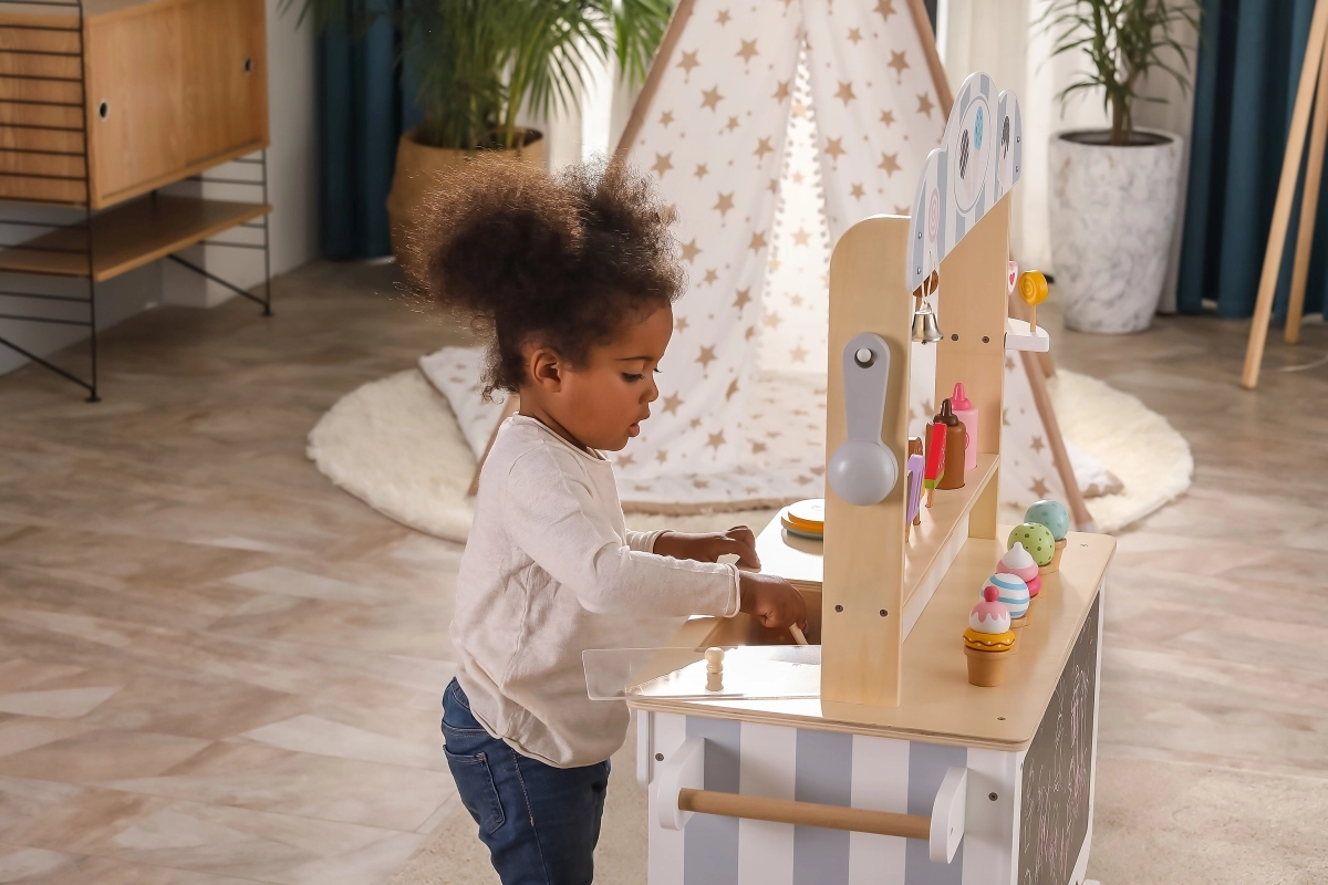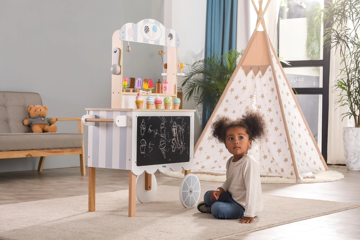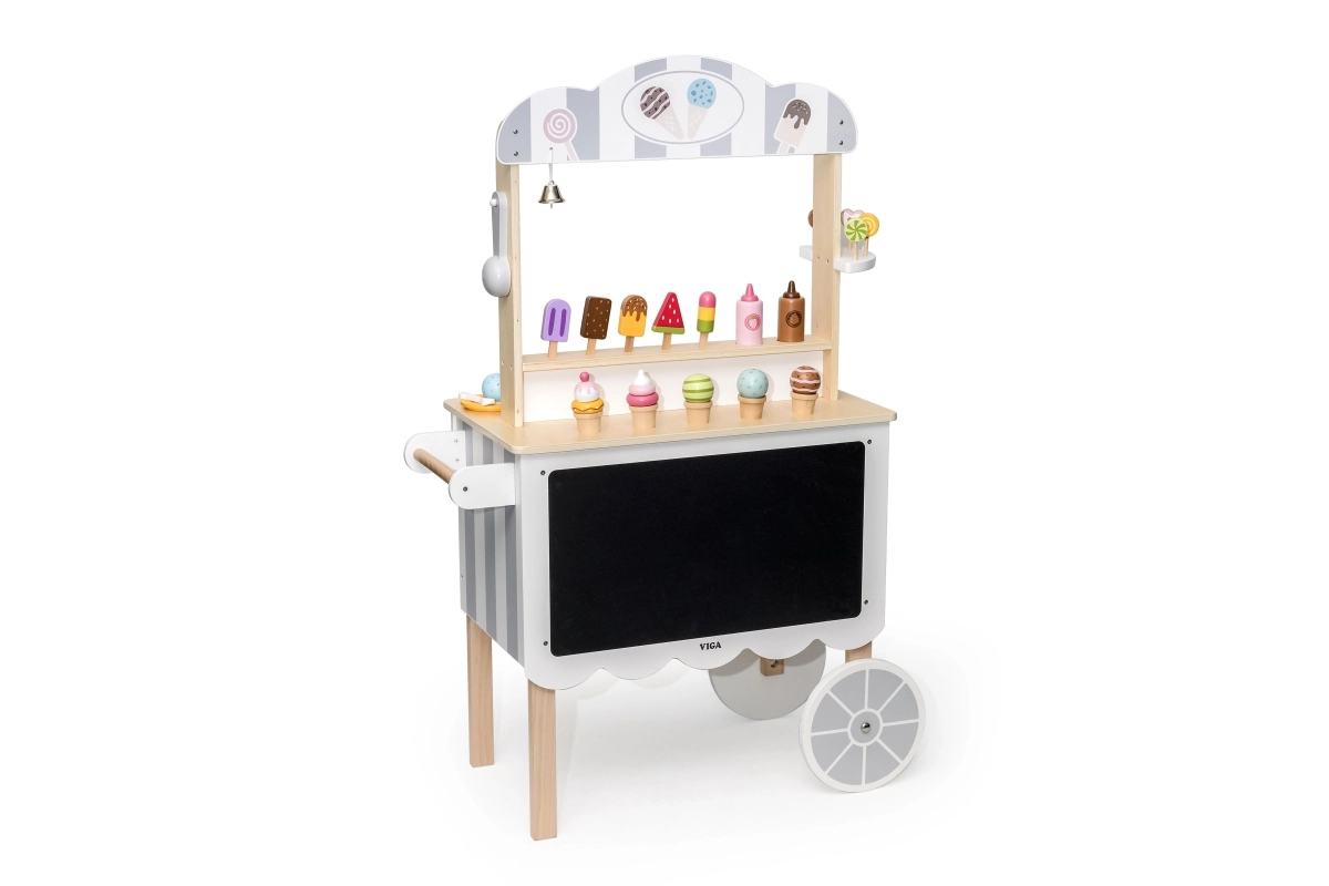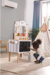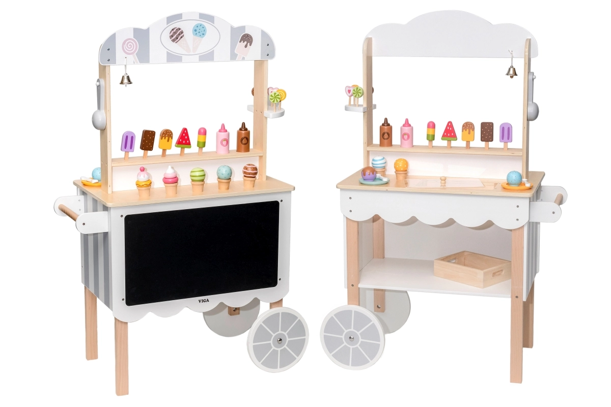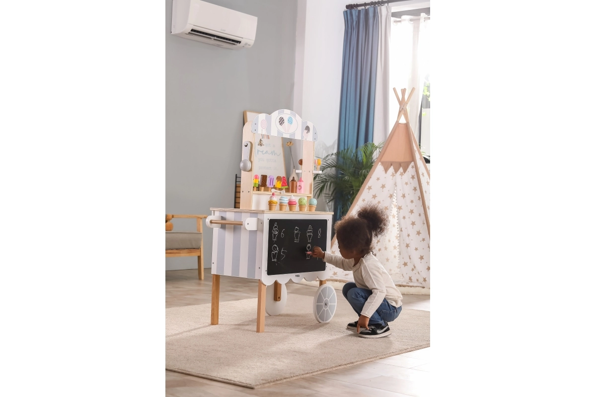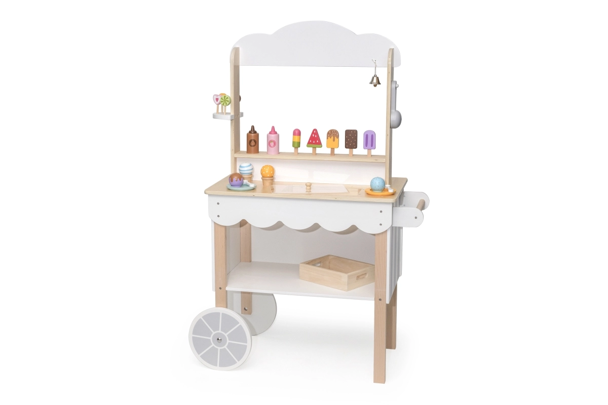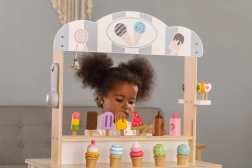 Šis medinis kiosko rinkinys veikia kaip parduotuvė, konditerija arba ledų kioskas. Vaikai gali sukurti savo mėgstamus scenarijus naudodami gausius priedus, tokius kaip čiulpinukai, ledai, vafliai ir užpilai. Puiki rinkinio dalis – lenta, skirta šiandienos meniu rašyti ar piešti. Visas rinkinys nudažytas netoksiškais dažais švelniomis spalvomis, kurios traukia vaikų dėmesį.