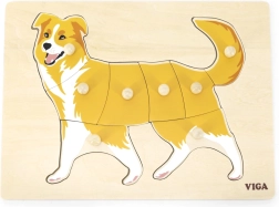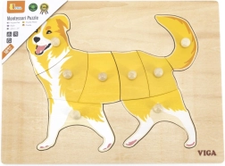 Pirmoji dėlionė vaikams nuo 18 mėn.: medinė montessori įstatyklė su šuns motyvu nuo VIGA. Dėl rankenėlių detales lengva laikyti, jos lavina smulkiąją motoriką, akies–ranka koordinaciją ir loginį mąstymą. Patvarus medis ir saugūs dažai. Lentos dydis 30 × 22,5 cm.