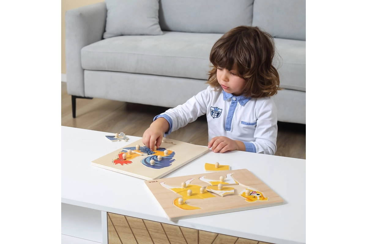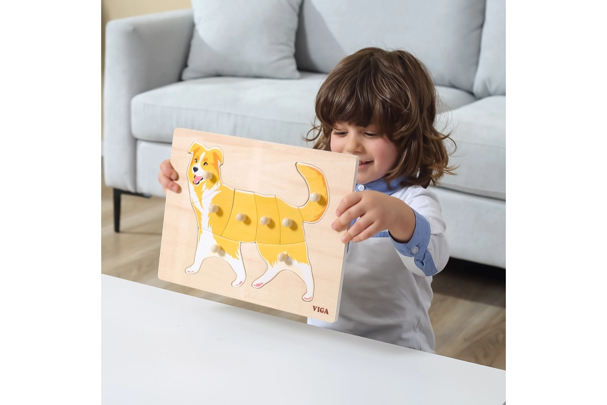 Patvari medinė lenta ir lygūs kraštai užtikrina saugų ir ilgalaikį žaidimą namuose ir darželyje. Aiškus šuns motyvas skatina dėlioti.