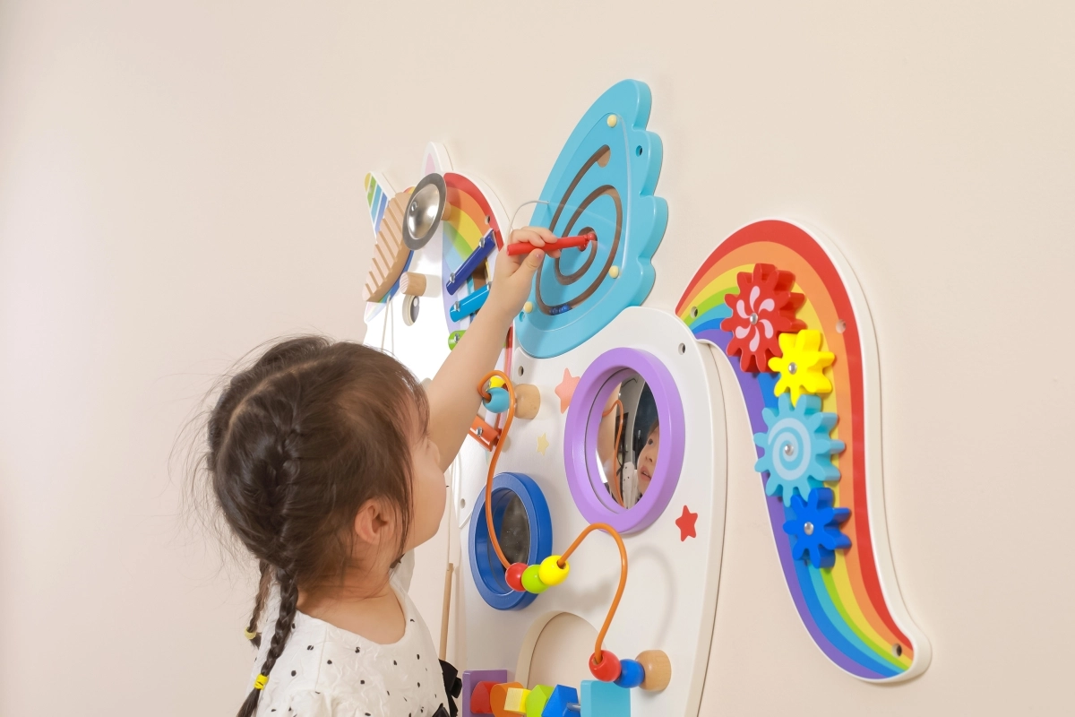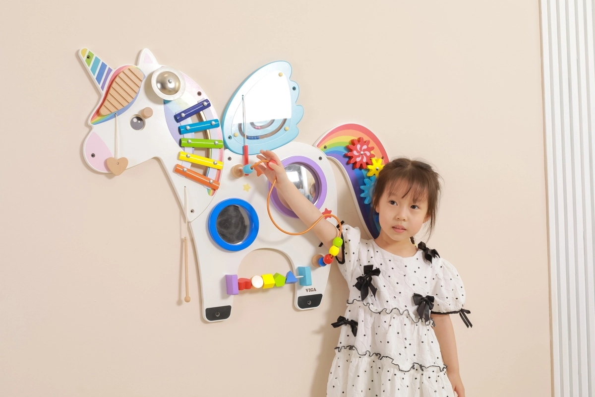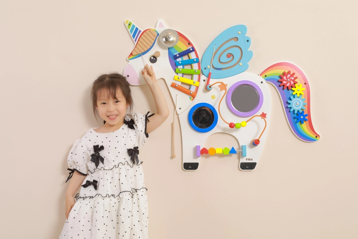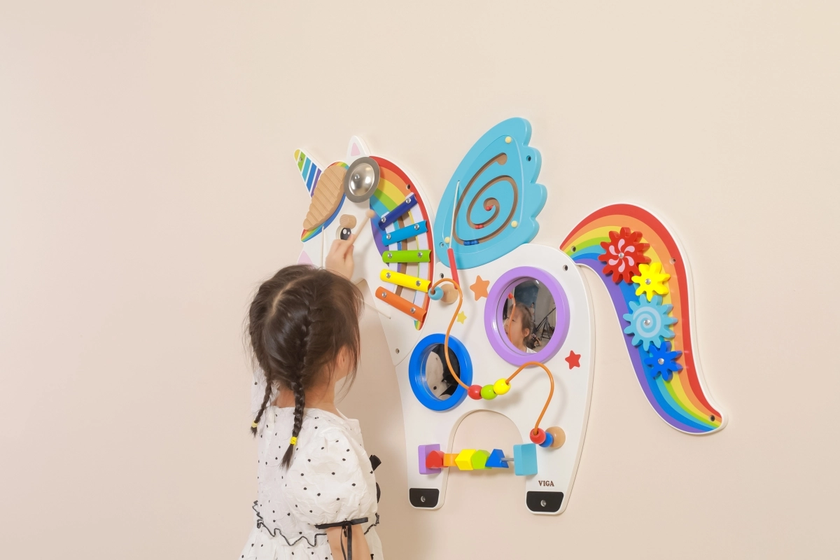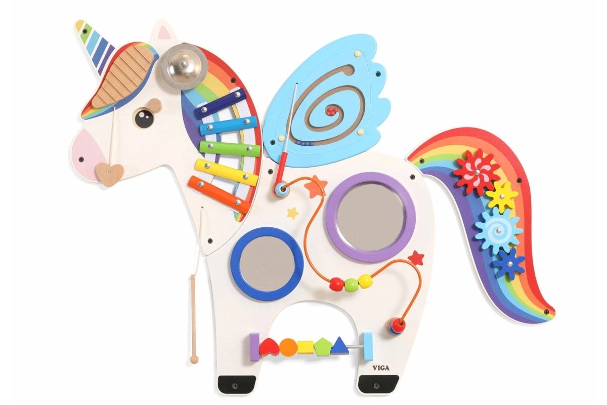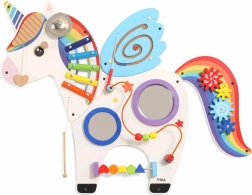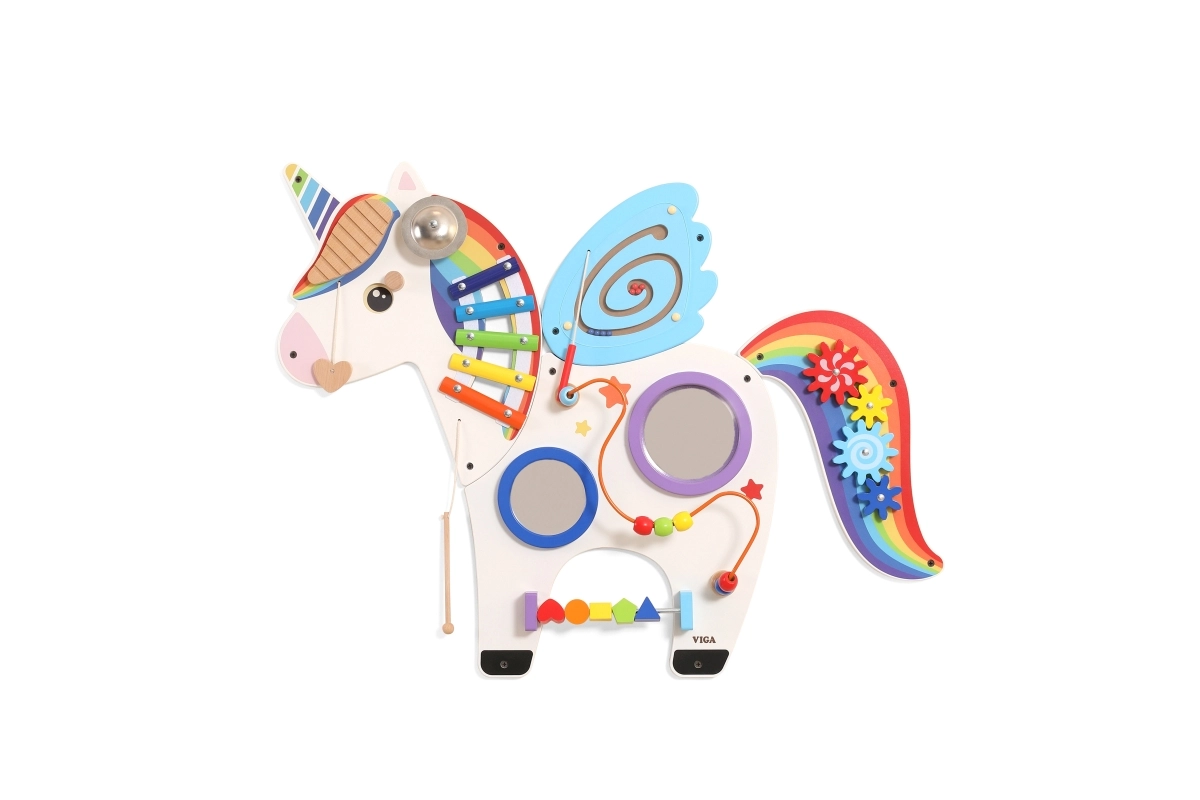 Ši daugiafunkcė sieninė lenta vienaragio pavidalu sujungia muzikinius, lytėjimo ir loginius elementus į vieną patrauklų komplektą. Vaikai gros ksilofonu, suks krumpliaračius, išbandys magnetinį labirintą ir veidrodėlius, lavins spalvų, formų atpažinimą bei judesių koordinaciją.