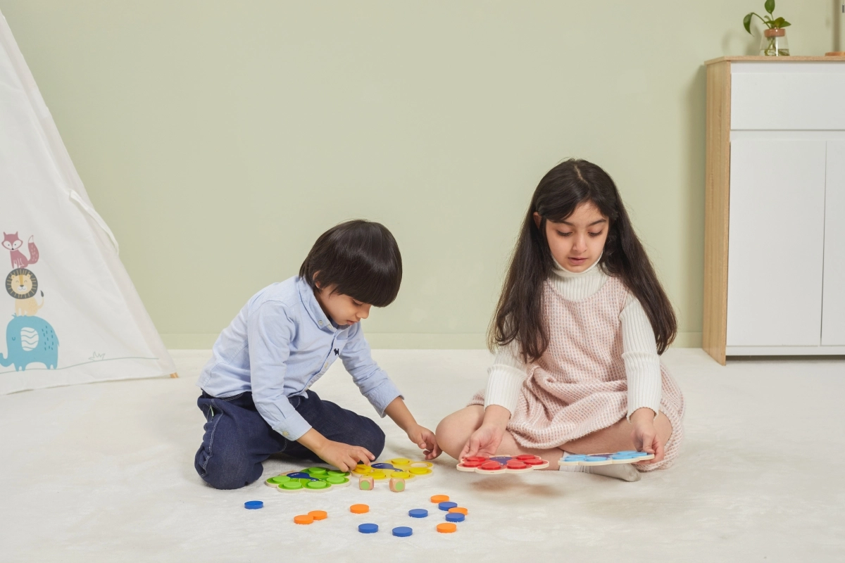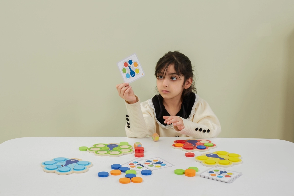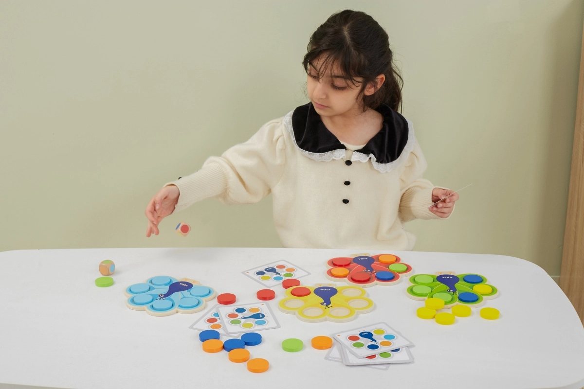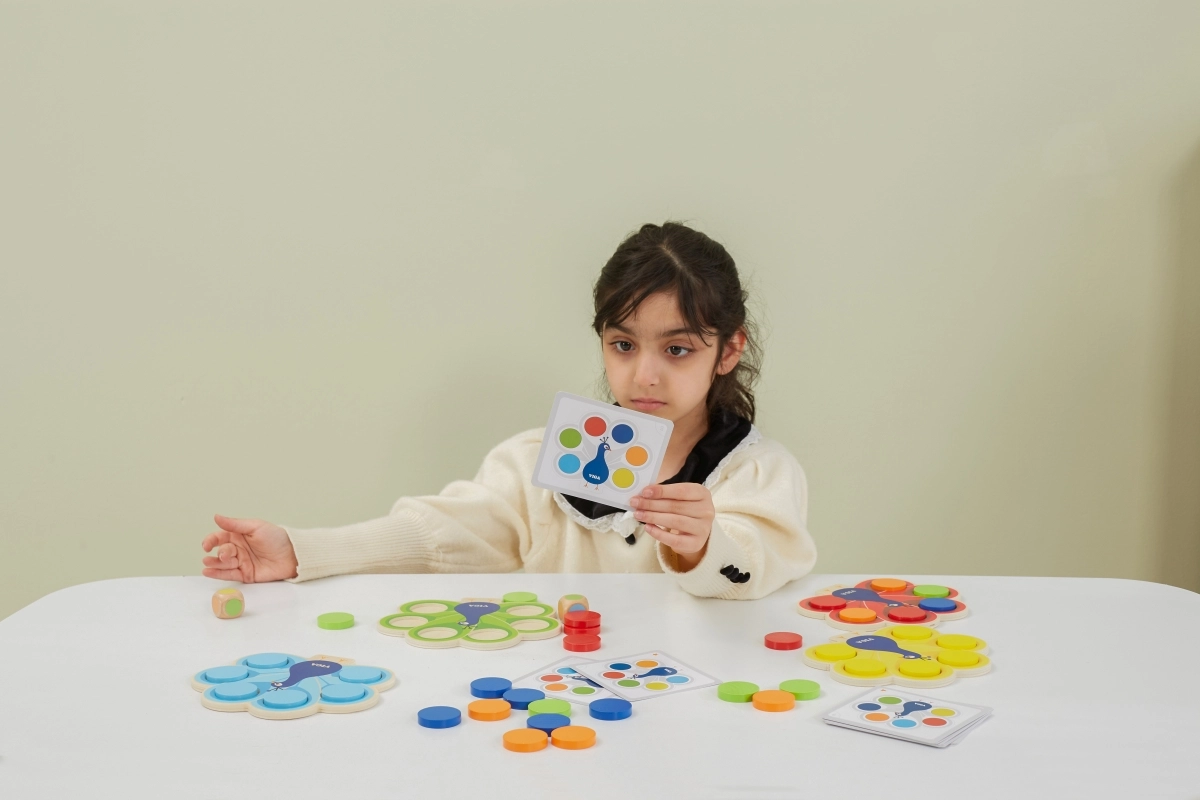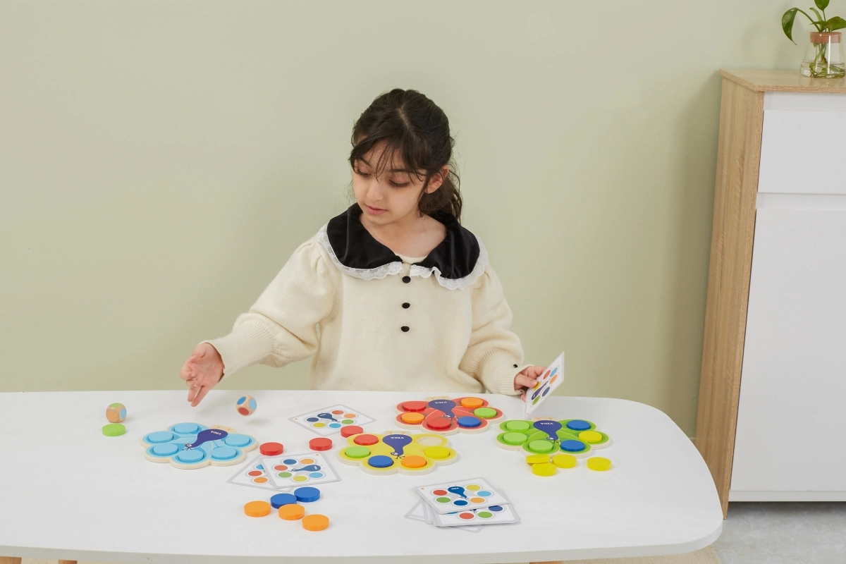 Vaikai dėlioja diskus pagal korteles arba metimo rezultatą, natūraliai įsisavina spalvas ir treniruoja dėmesį bei logiką.
