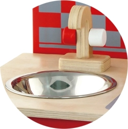 Dėl kokybiškos medinės konstrukcijos ši virtuvėlė ne tik patvari, bet ir estetiškai patraukli. Pakuotėje taip pat rasite žaidimo priedus: mentele, samtį, puodą su dangčiu, keptuvę su dangčiu ir du prieskoninius indelius.