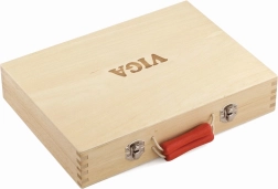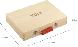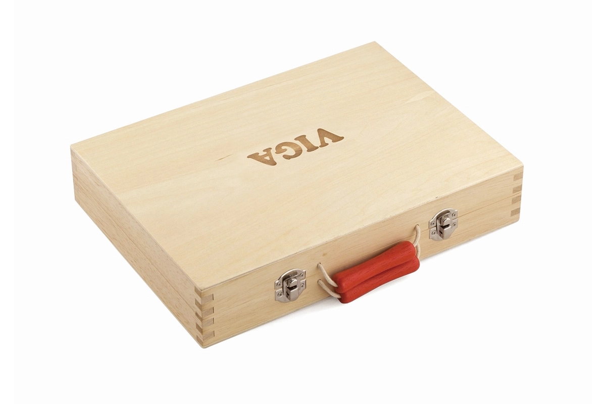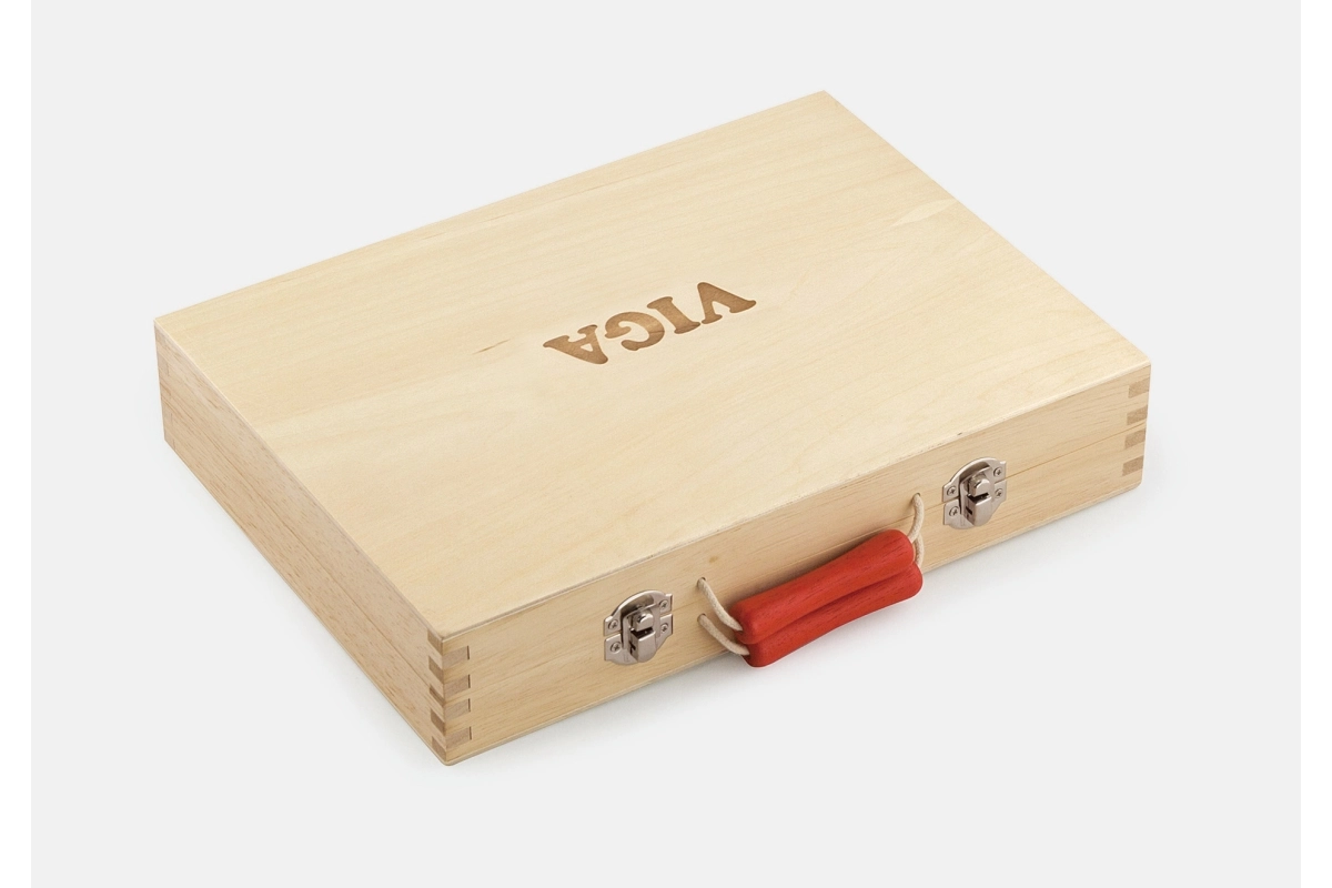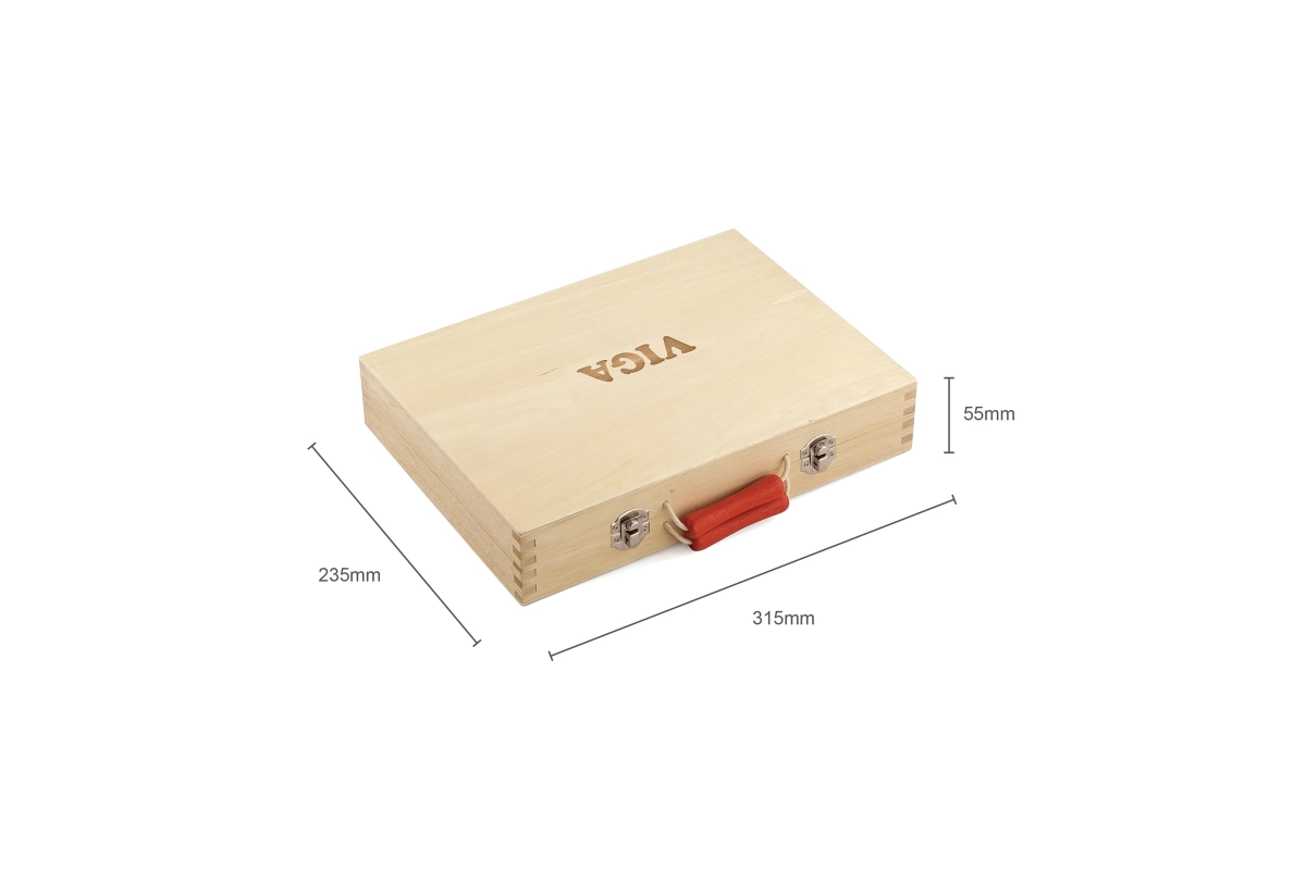 Tvirtas medinis lagaminėlis su metalinėmis sagtelėmis ir raudona rankena viską išlaiko savo vietoje, todėl nė viena detalė nepasimes. Dėl aiškaus išdėstymo kiekvienas įrankis turi savo vietą, o visas rinkinys lengvai nešiojamas į svečius, keliones ar vaiko kambarį.