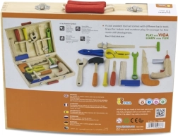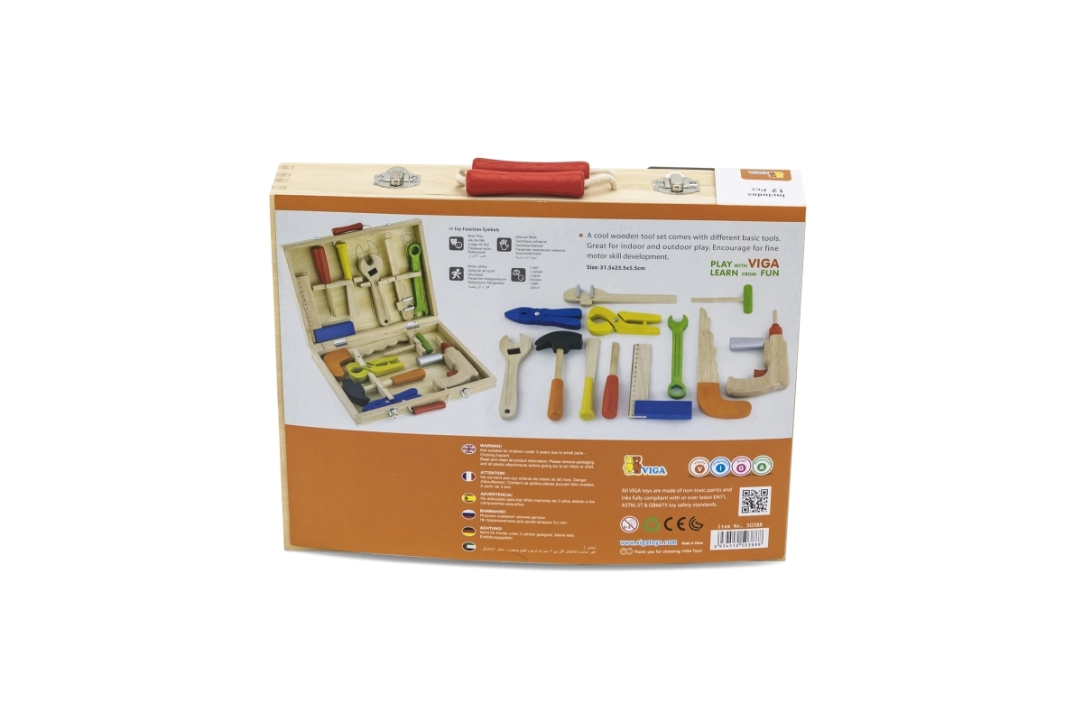 Šis kokybiškas VIGA medinis įrankių rinkinys suteikia vaikams realistišką darbo su įrankiais patirtį. Spalvingi ir patvarūs daiktai, tokie kaip gręžtuvas, plaktukas, atsuktuvas, raktas ar pjūklelis, skatina vaizduotę ir siūlo saugų būdą lavinti įgūdžius bei akių–rankų koordinaciją.