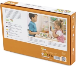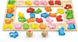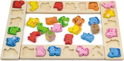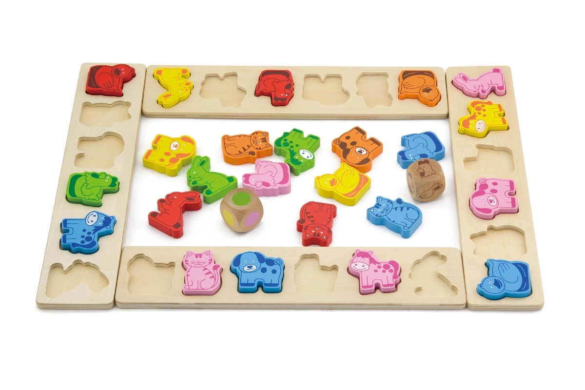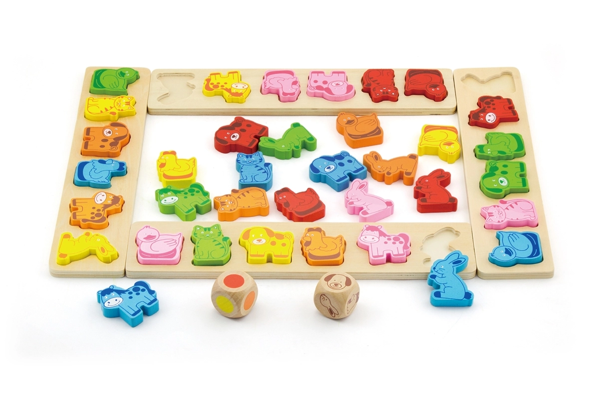 Linksmas medinis žaidimas vaikams nuo 3 metų, kuris lavina spalvų ir gyvūnų atpažinimą, treniruoja greitą mąstymą ir reakciją ir skatina kalbinius, skaičiavimo ir komandinio darbo įgūdžius. Rinkinys iš aukštos kokybės faneros ir buko medienos sudarytas iš 4 lentų, 36 gyvūnų detalių ir dviejų kauliukų – spalvoto ir su gyvūnais.