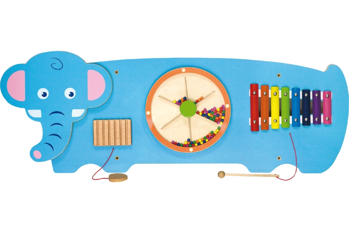 Sieninis skydelis mielo dramblio formos paverčia sieną kūrybiniu kampeliu. Vaikai mėgaujasi saugiu sensoriniu ir muzikiniu žaidimu, kurio metu lavina klausą, regą, lytėjimą ir akies-rankos koordinaciją. Dėl tvirto medinio korpuso ir montavimo ant sienos lenta yra stabili ir paruošta kasdieniam naudojimui.