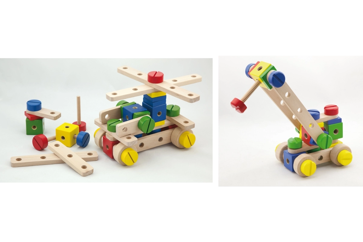 Ši kokybiška medinė kaladėlių rinktinė suteikia vaikams begalines kūrybos galimybes. Su 53 spalvotomis detalėmis, kaiščiais, varžteliais ir jungtimis lengvai pastatysite paprastus modelius ir fantazijos konstrukcijas. Pridedama aiški iliustruota brošiūra, kuri įkvepia ir žingsnis po žingsnio veda per pirmuosius projektus.