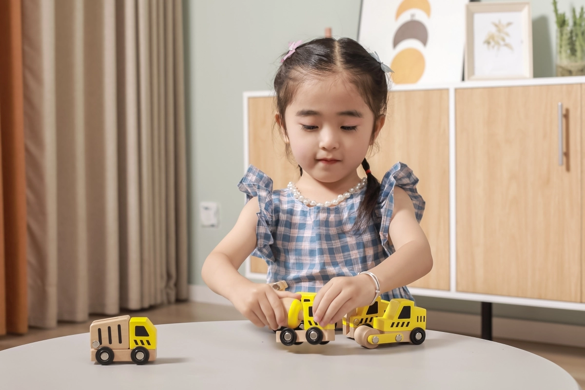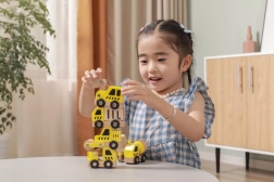 Kiekviena transporto priemonė turi funkcinius ratelius, kad sklandžiai riedėtų, o kai kurios detalės imituoja judančius elementus (pvz., kaušą, maišyklę ar kraną), kas skatina natūralų smalsumą ir akies-rankos koordinacijos lavinimą.