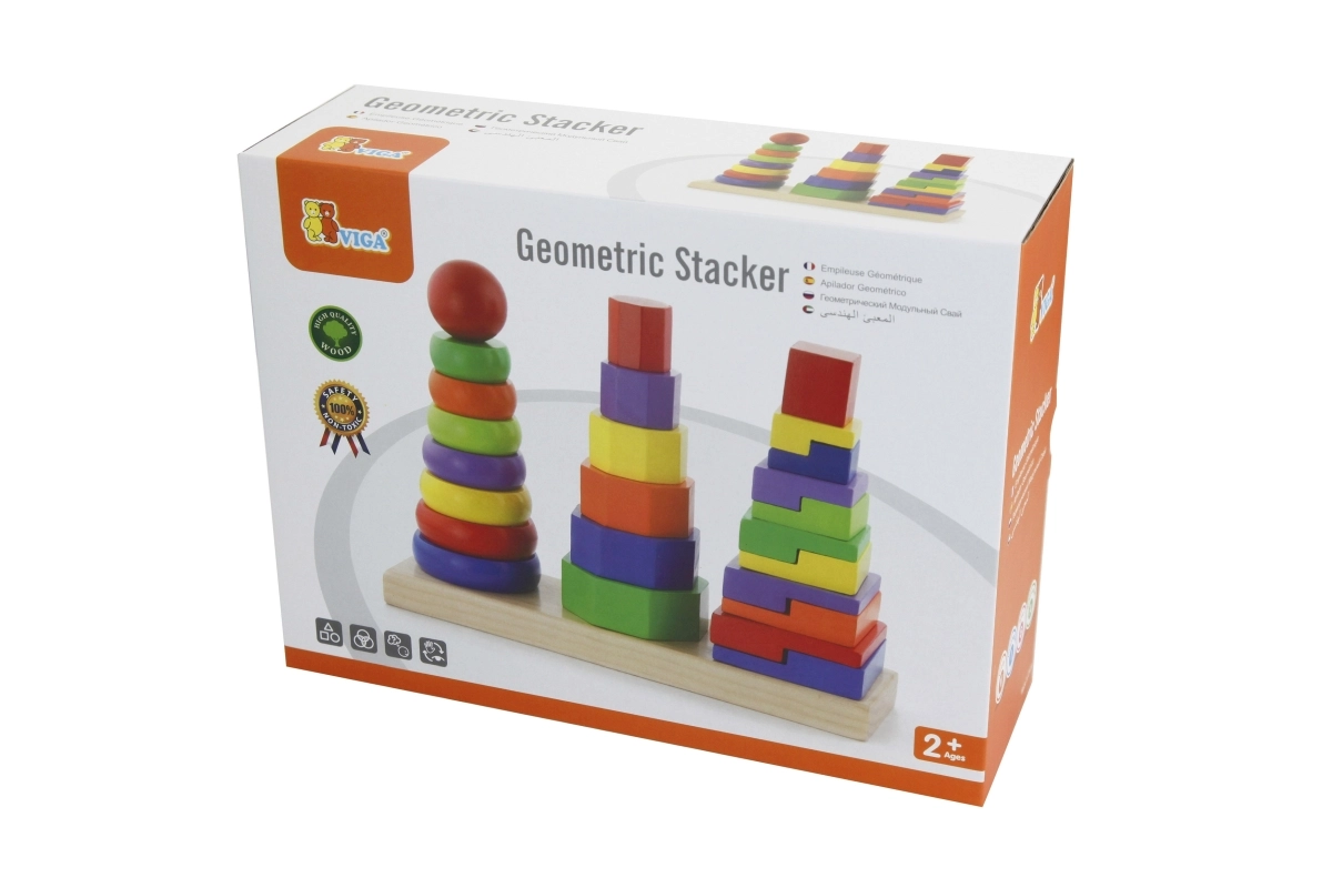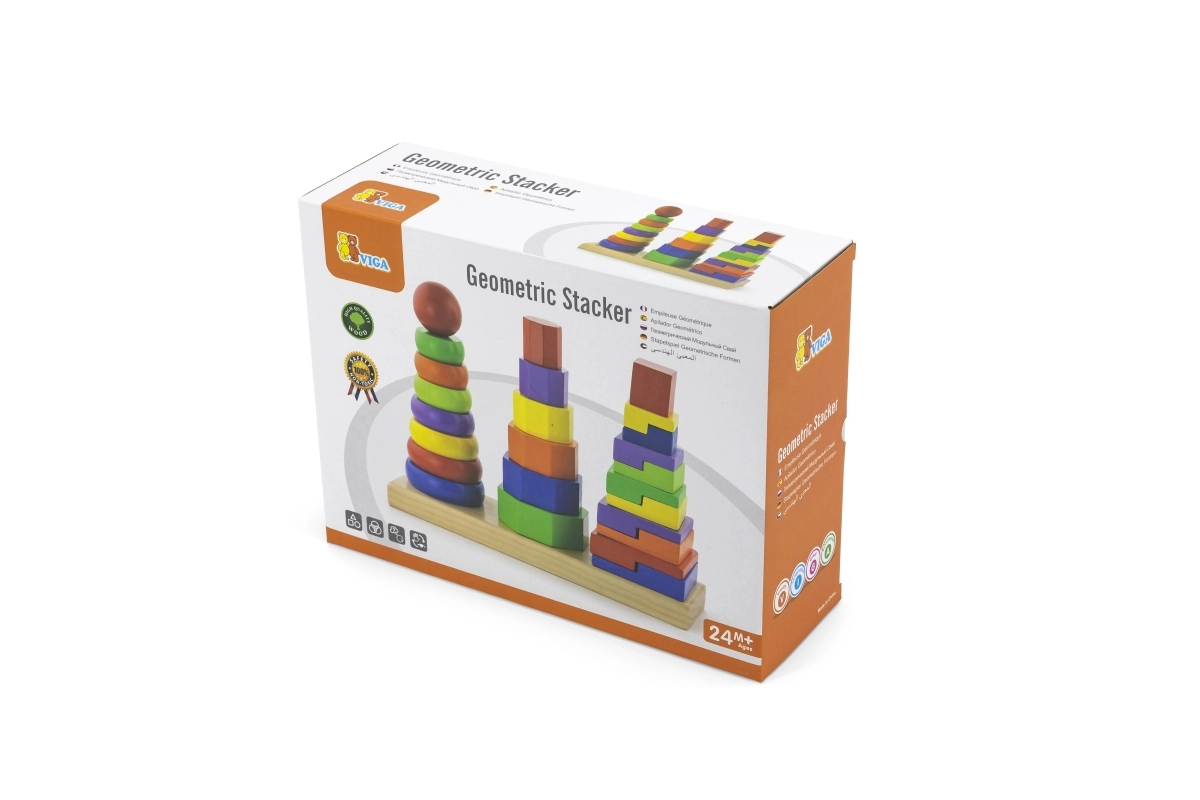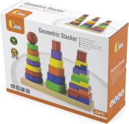 Medinė dėlionė piramidė – ideali edukacinė priemonė vaikams nuo 2 metų, kuri skatina smulkiosios motorikos ir figūrų atpažinimo ugdymą dėl spalvotų geometrinių detalių.