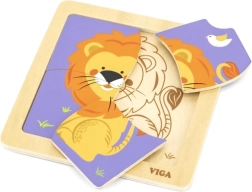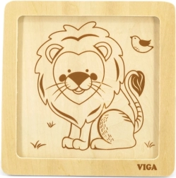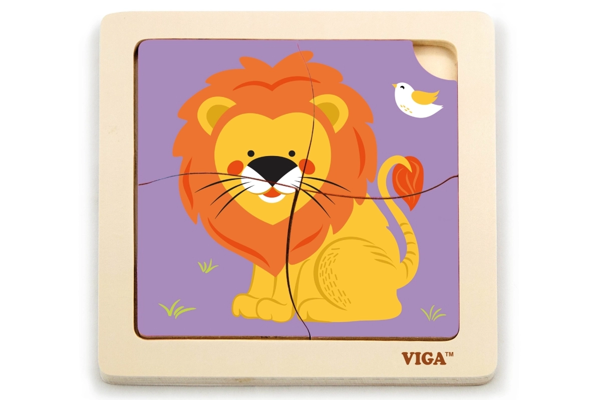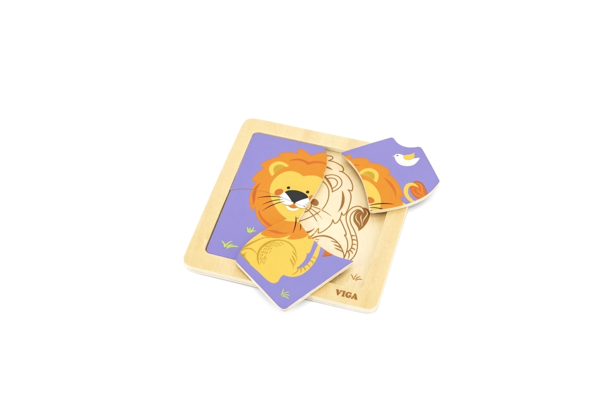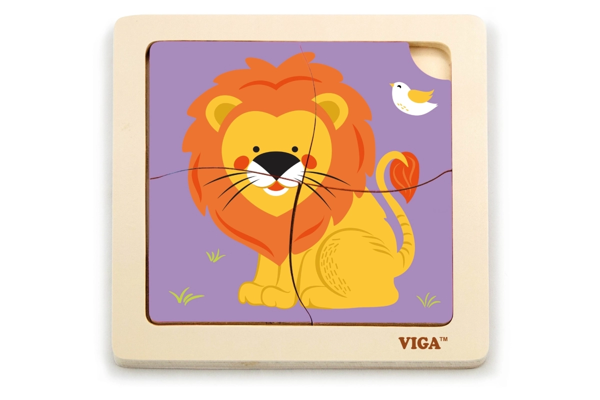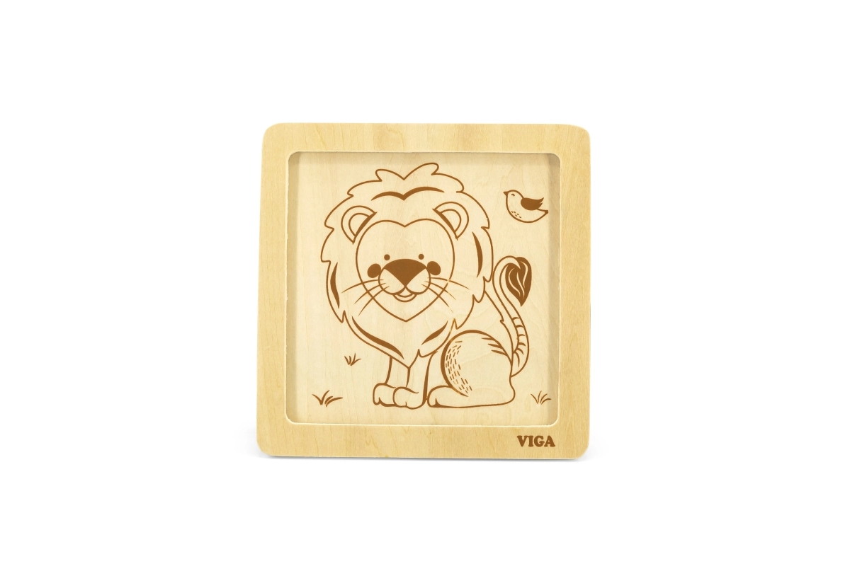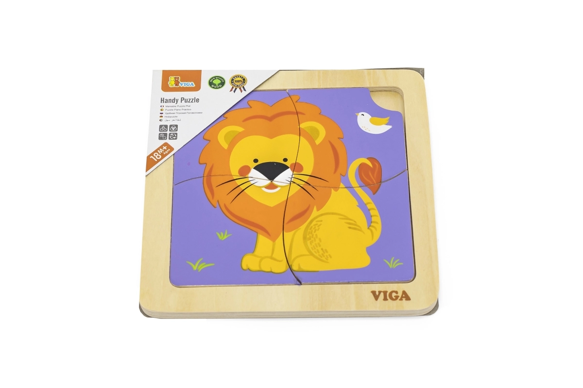 Ši kokybiška medinė dėlionė su linksmu liūto atvaizdu sukurta mažoms rankytėms. Dėl keturių tvirtų, glotniais kraštais detalių vaikai lengvai mokosi derinti formas, lavina kantrybę ir susikaupimą. Praktiška medinė bazė laiko detales vietoje ir palengvina dėliojimą.