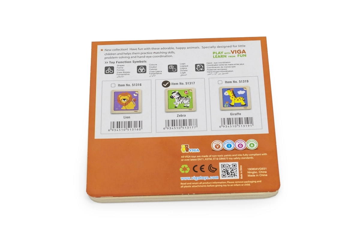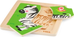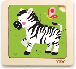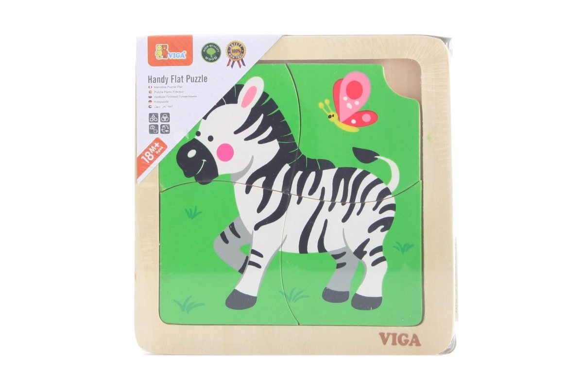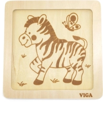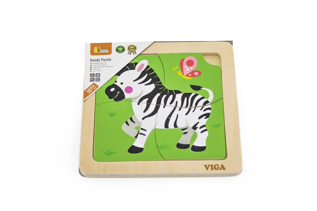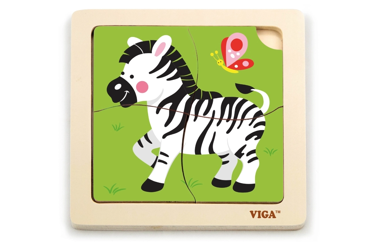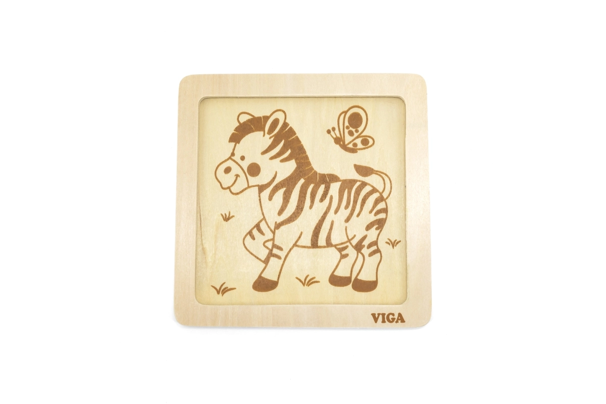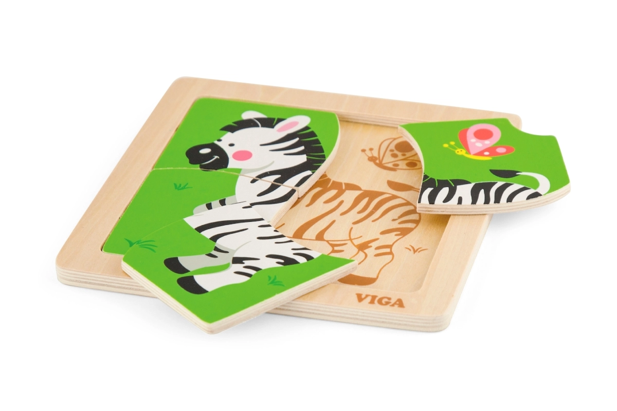 Medinė VIGA dėlionė su zebros motyvu – ideali didaktinė priemonė vaikams, skatinanti motorinių įgūdžių ir kognityvinio mąstymo raidą per žaismingą mokymąsi.