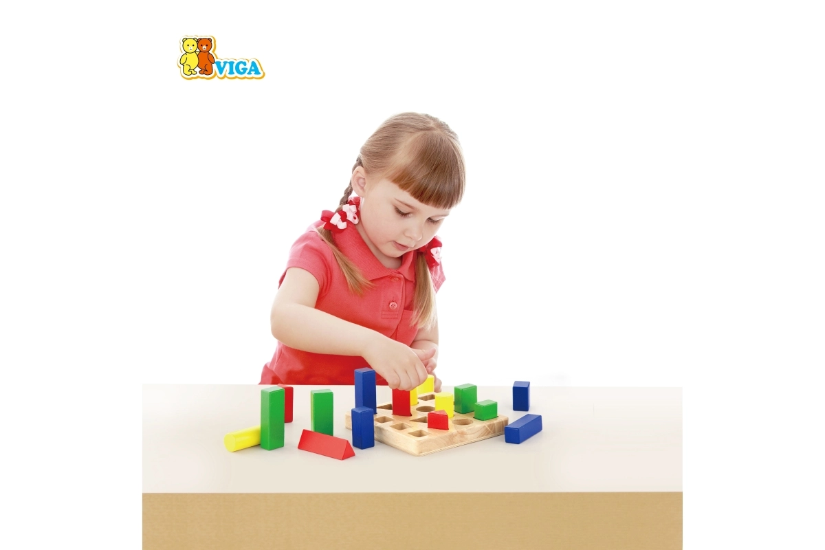 Vaikai rūšiuoja ir įstato spalvotas geometrines detales į teisingas vietas, natūraliai įsisavindami formas ir spalvas.
