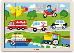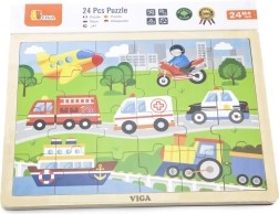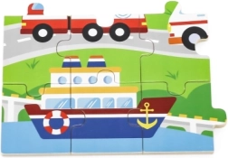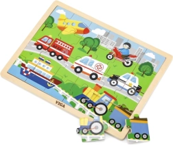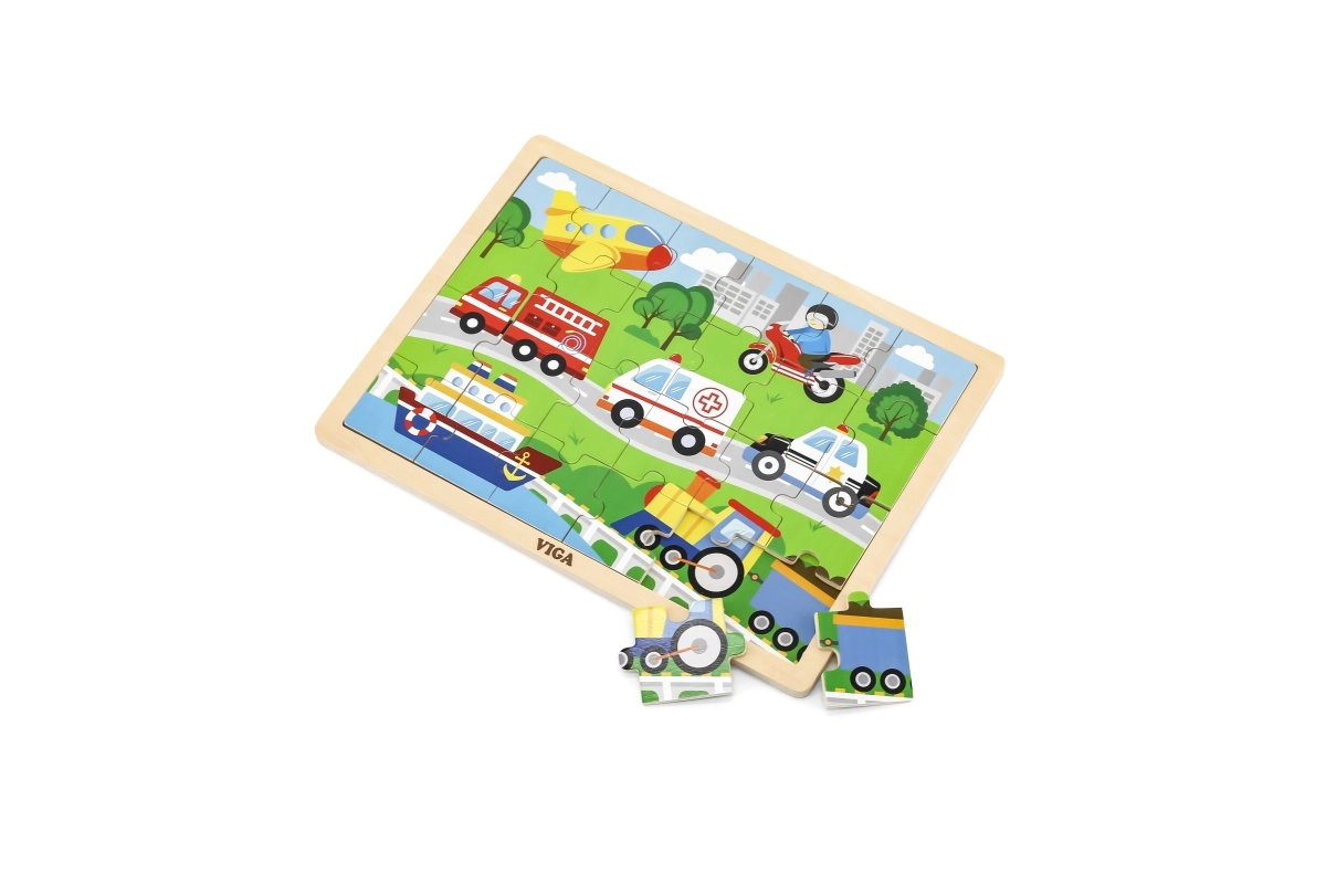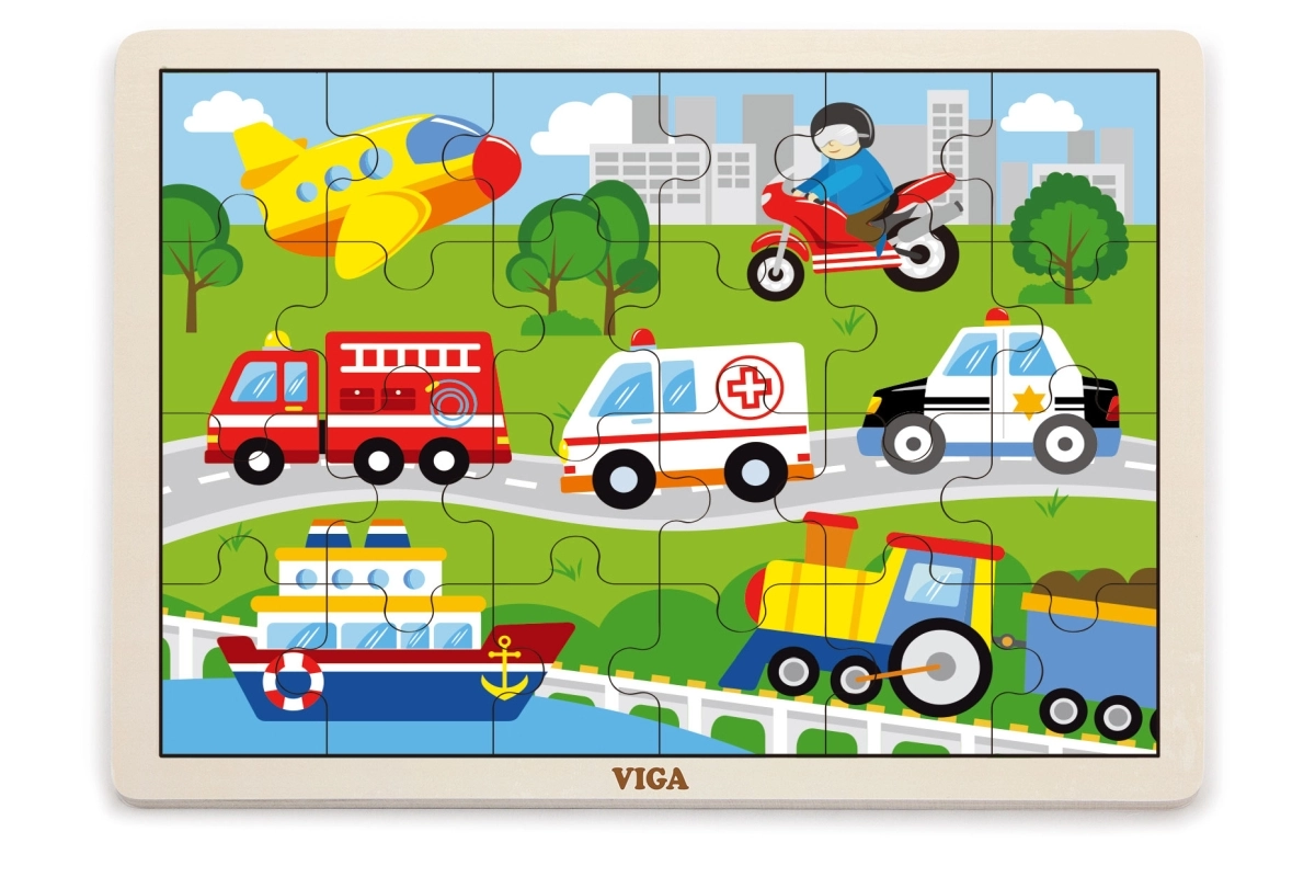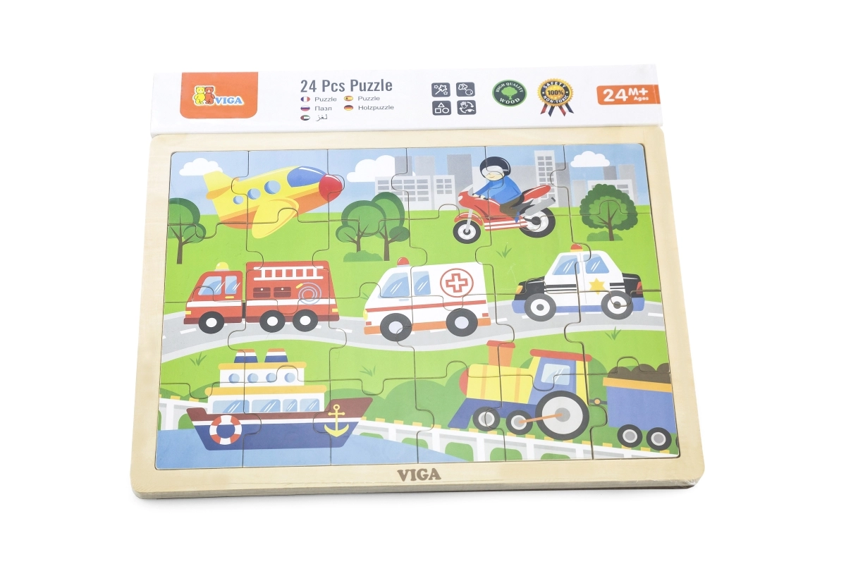 Ši medinė dėlionė su transporto priemonių atvaizdais – puikus pasirinkimas pirmajai „didesnei“ dėlionei. Dėl 24 dalių dėliojimas suteikia būtent tiek iššūkio, kiek reikia – skatina susikaupimą ir džiaugsmą užbaigus paveikslą, kurio matmenys apie 27,5 × 20 cm. Ryškios transporto iliustracijos (greitoji, gaisrinė, policijos automobilis, laivas, lėktuvas ir kt.) natūraliai motyvuoja vaikus kartoti žaidimą.