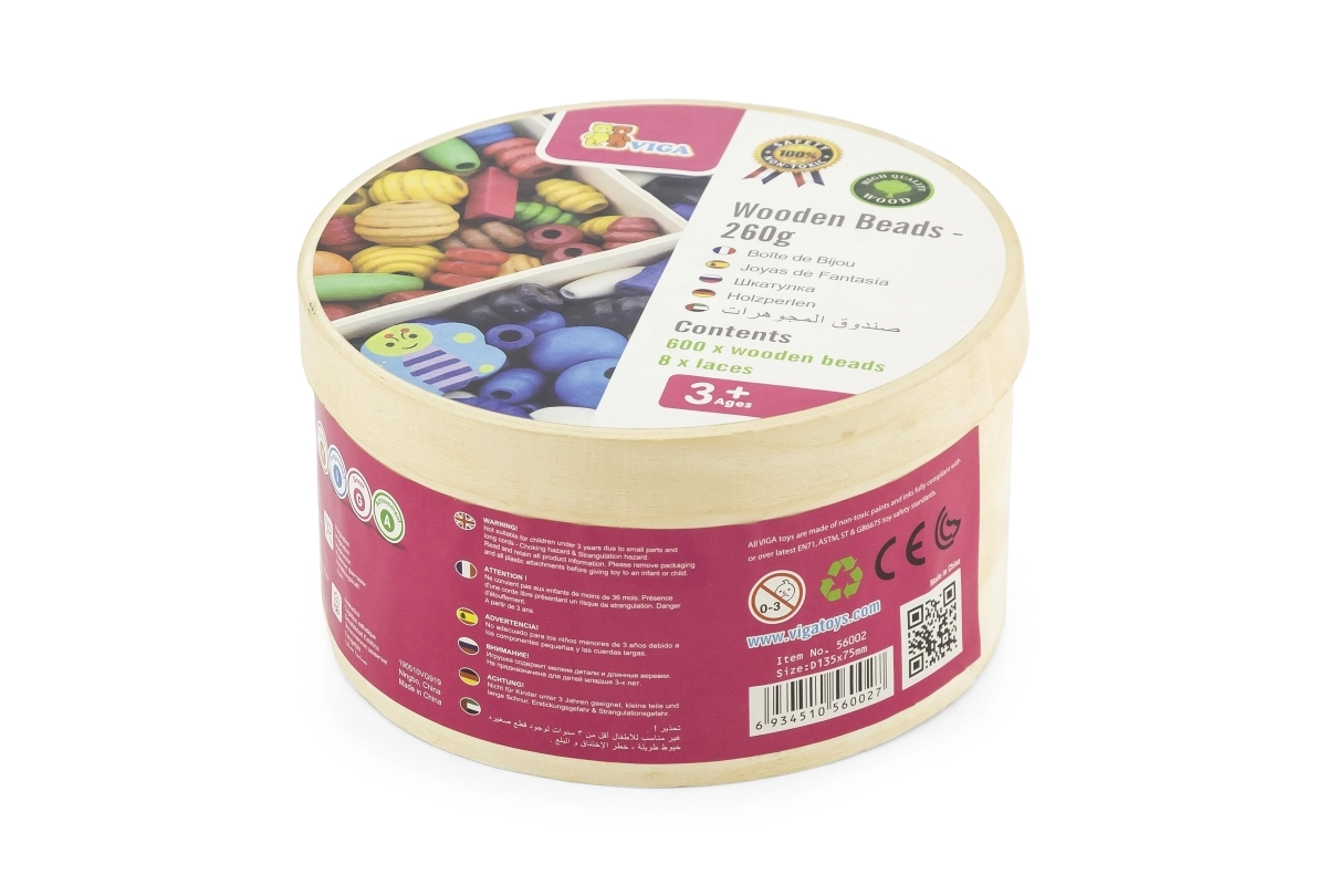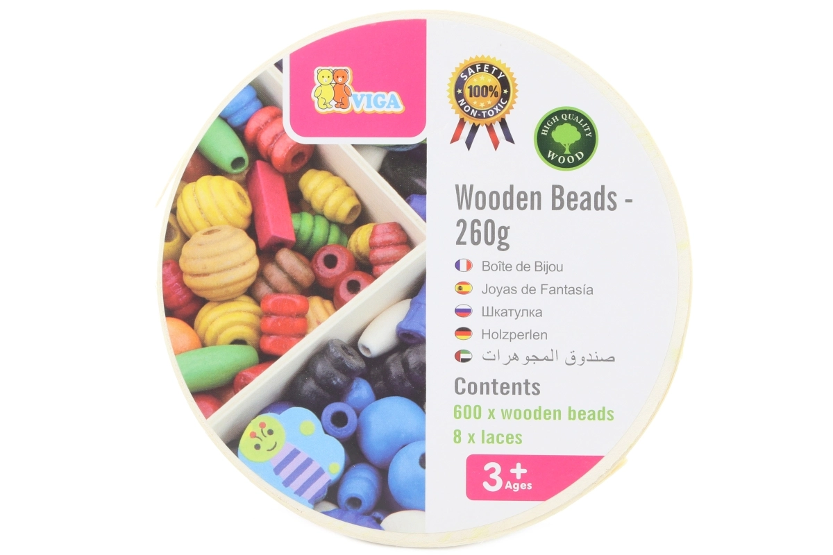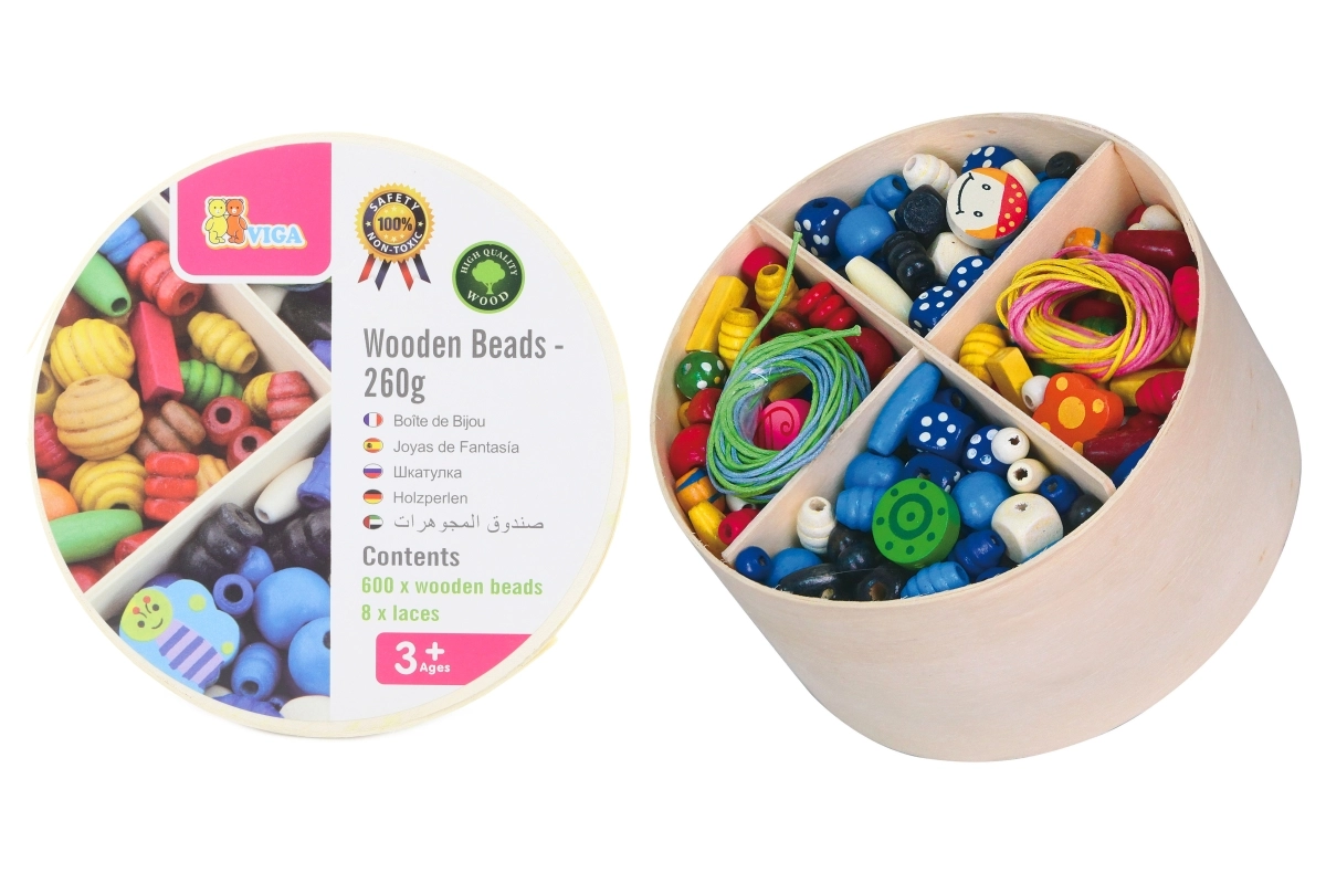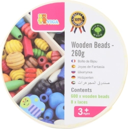 Mediniai karoliukai Viga siūlo begalines kūrybos ir pramogų galimybes. Naudodami 8 pridedamas virveles vaikai gali verti iš viso 600 karoliukų ir sukurti nuostabias apyrankes bei vėrinius. Šis žaislas padeda lavinti vaikų kūrybiškumą ir smulkiąją motoriką.