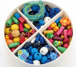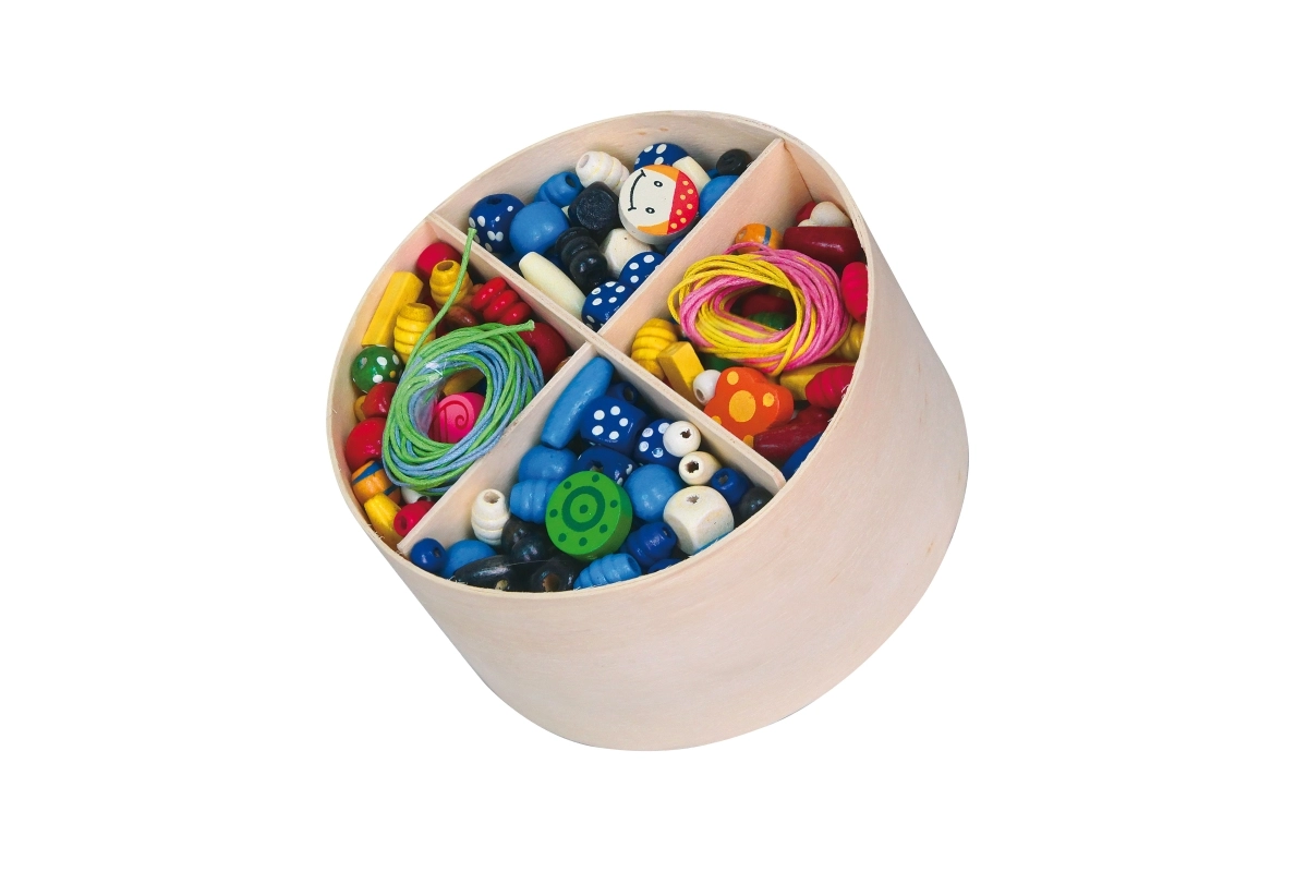 Rinkinyje yra medinė dėžutė su pertvaromis, idealiai tinkanti karoliukams ir virvelėms laikyti.