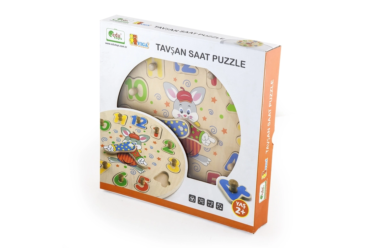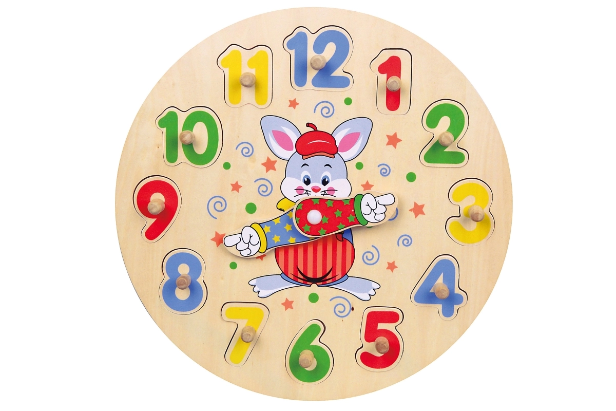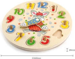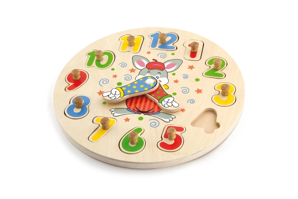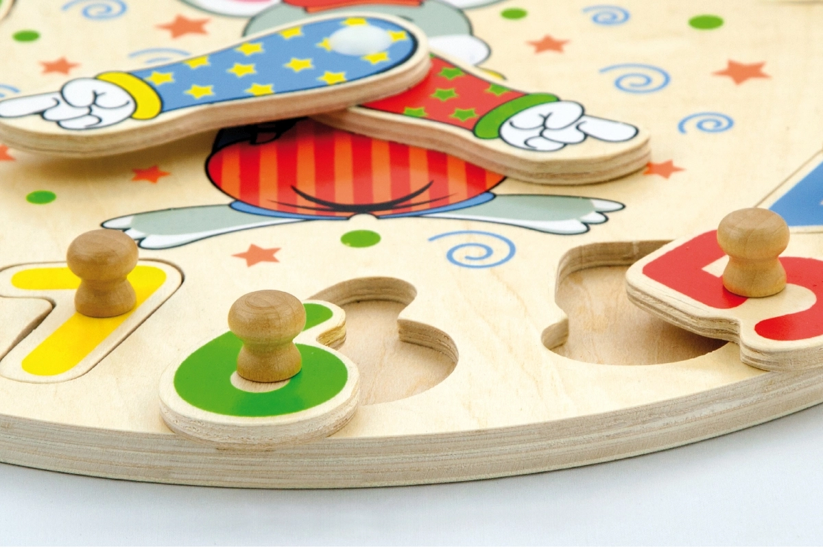 Šis medinis laikrodis sujungia dėlionę su laiko mokymusi. Spalvotos sunumeruotos detalės su praktiškomis rankenėlėmis puikiai tinka mažoms vaiko rankoms ir padeda atpažinti skaičius 1–12. Dėliodami vaikai lavina kantrybę, akių–rankos koordinaciją bei formų ir spalvų suvokimą.