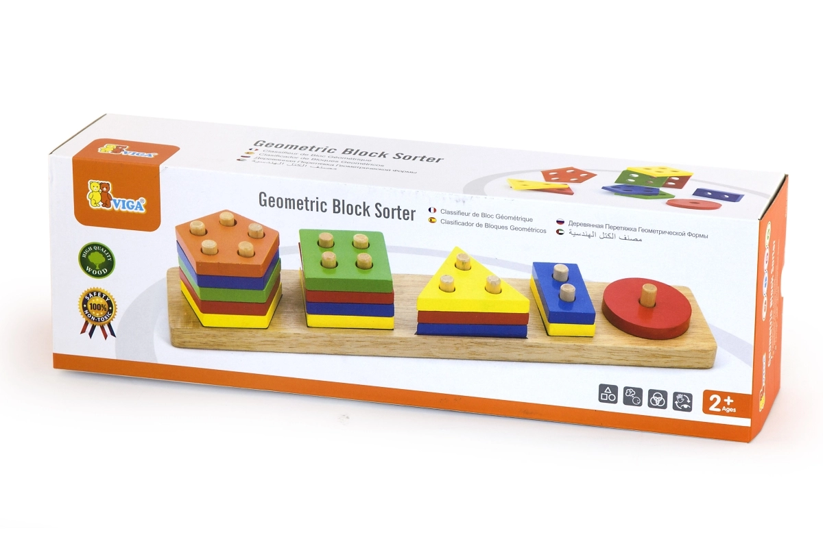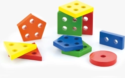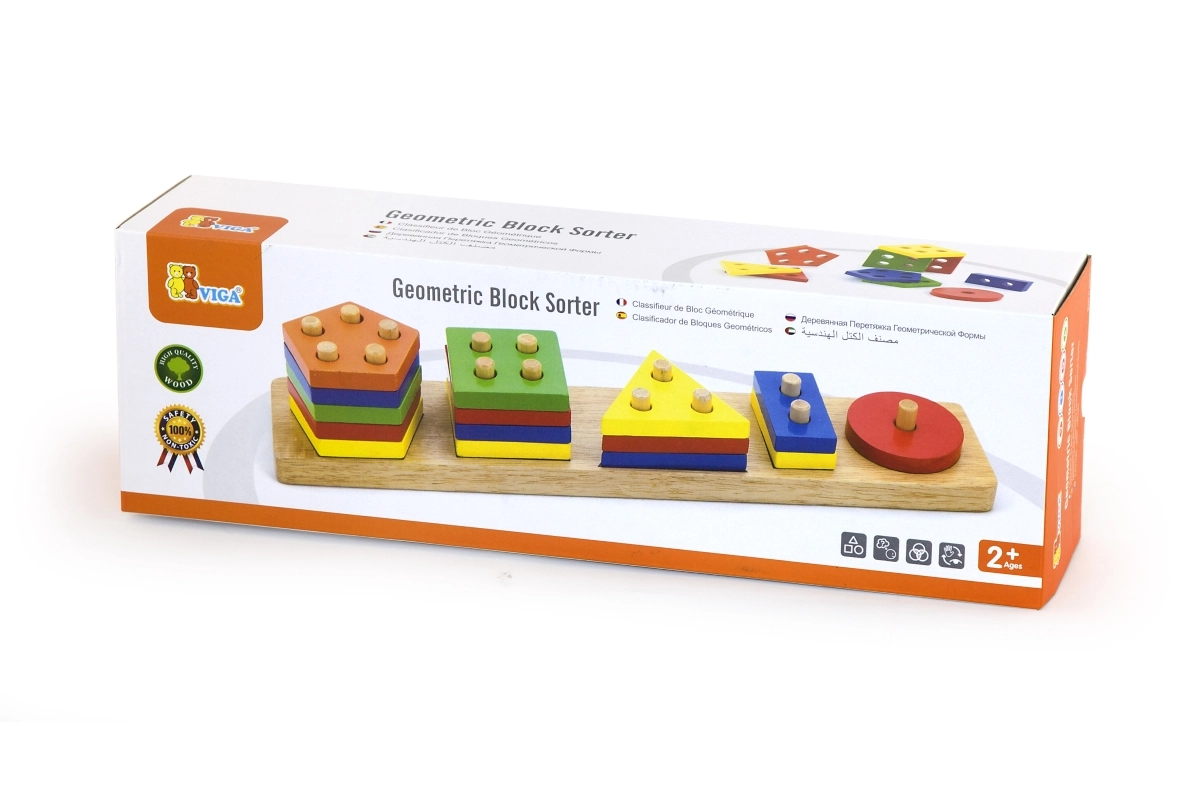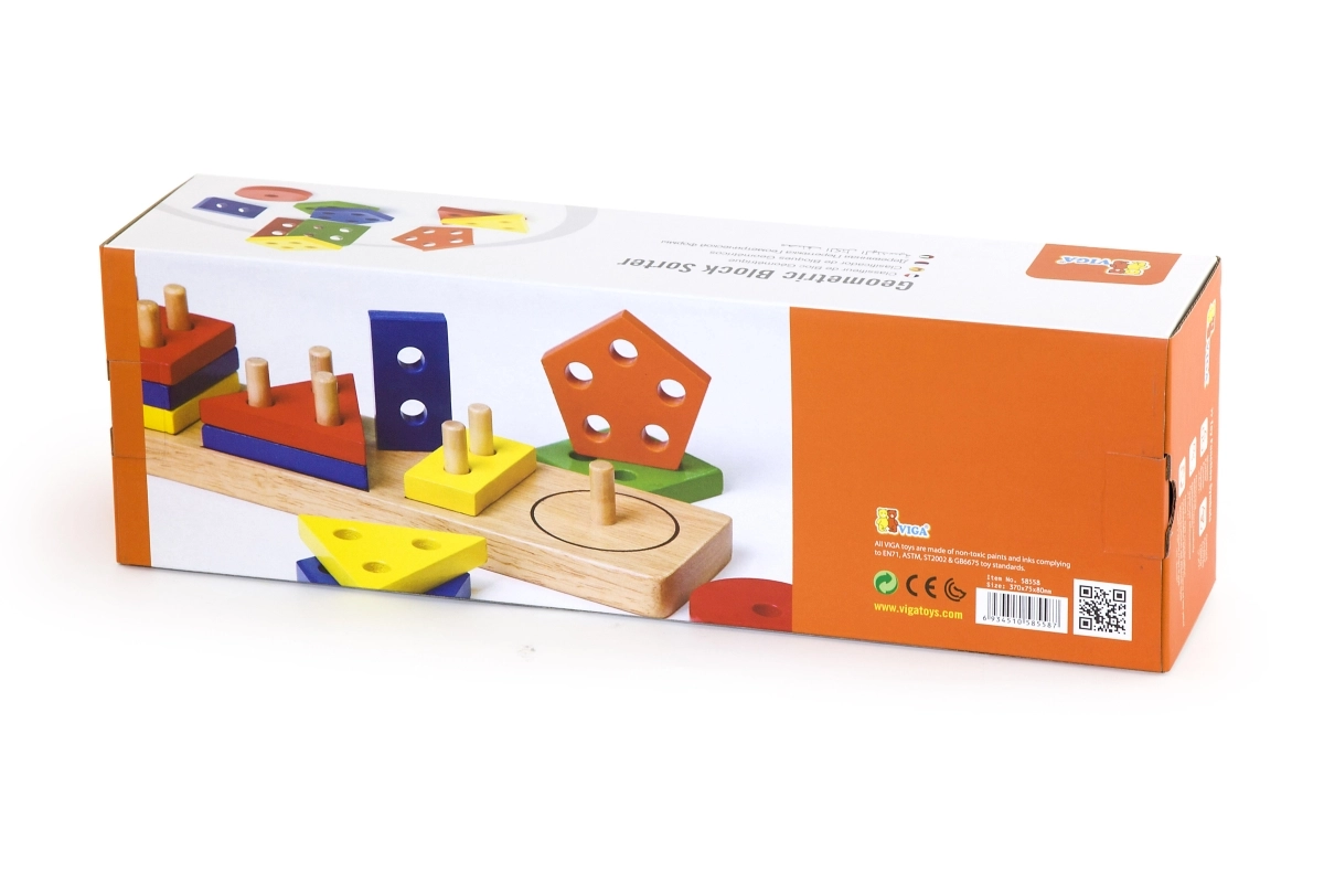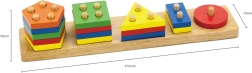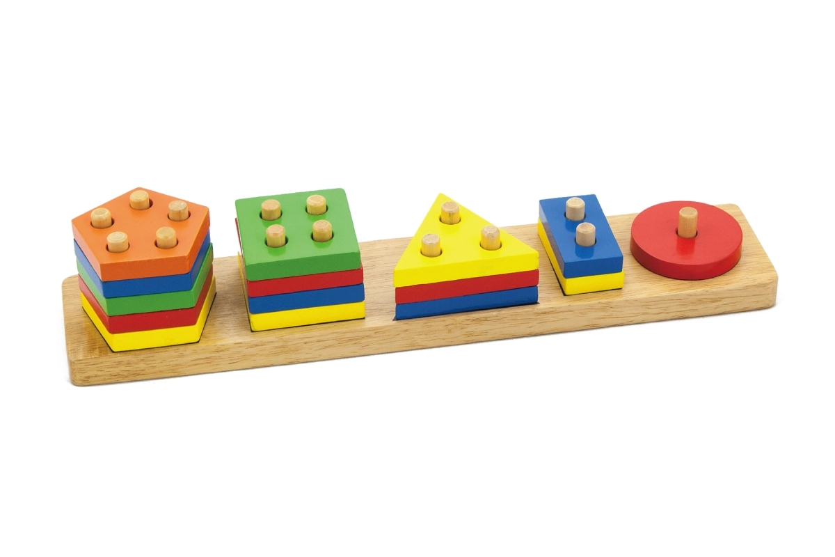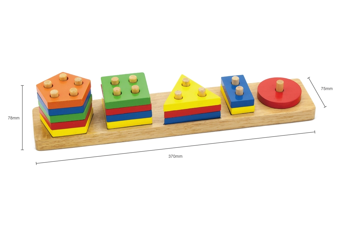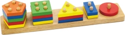 Ši tvirta medinė dėlionė sujungia rūšiavimą ir figūrų verimą ant kaištelių. Vaikai mokosi atskirti spalvas ir geometrines figūras, lavina akių-rankų koordinaciją ir gerina smulkiąją motoriką valdydami detales. Medis yra lygiai šlifuotas, spalvos – ryškios ir patrauklios.