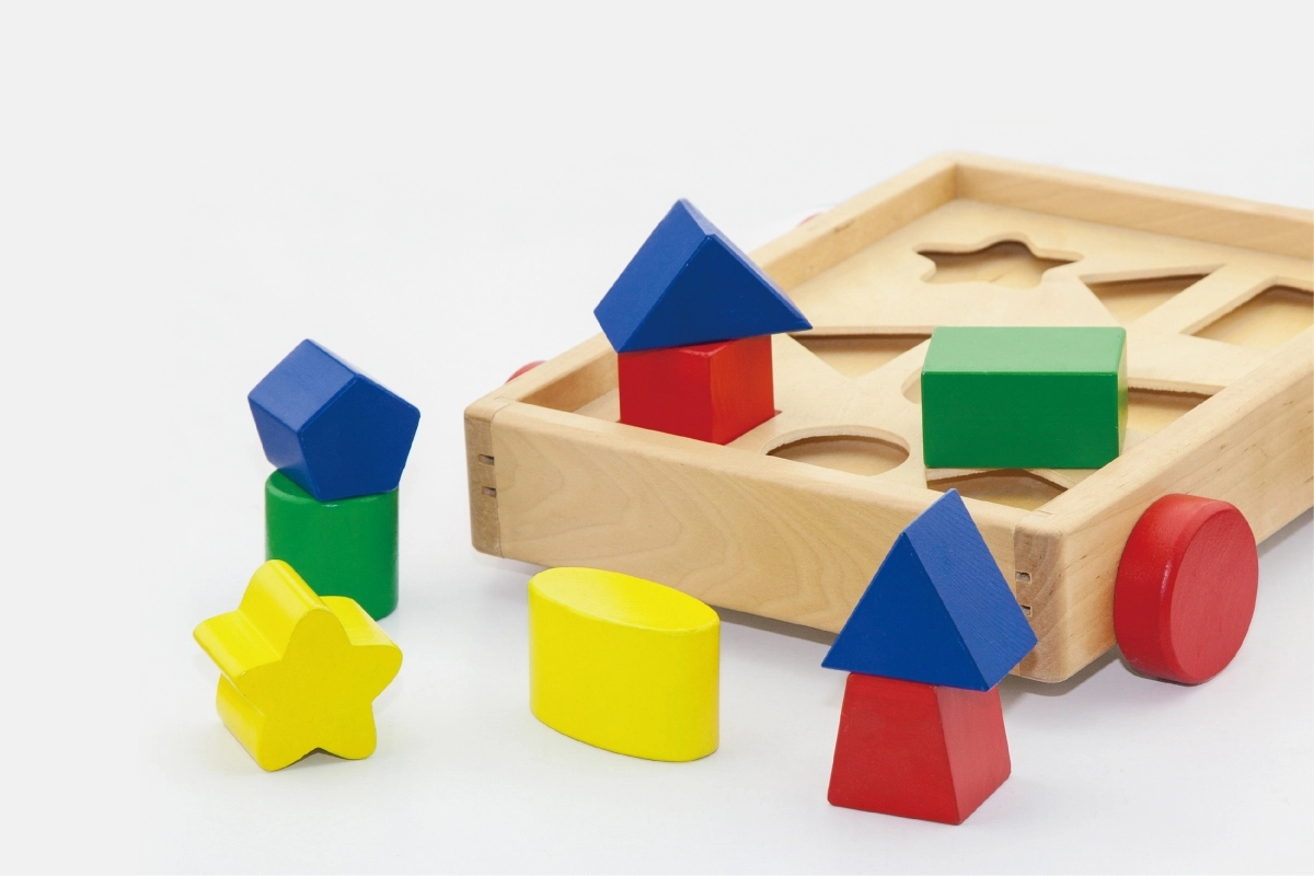 Vežimėlyje yra įvairių geometrinių formų, kurios leidžia vaikams žaismingai mokytis atpažinti skirtingas figūras.