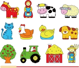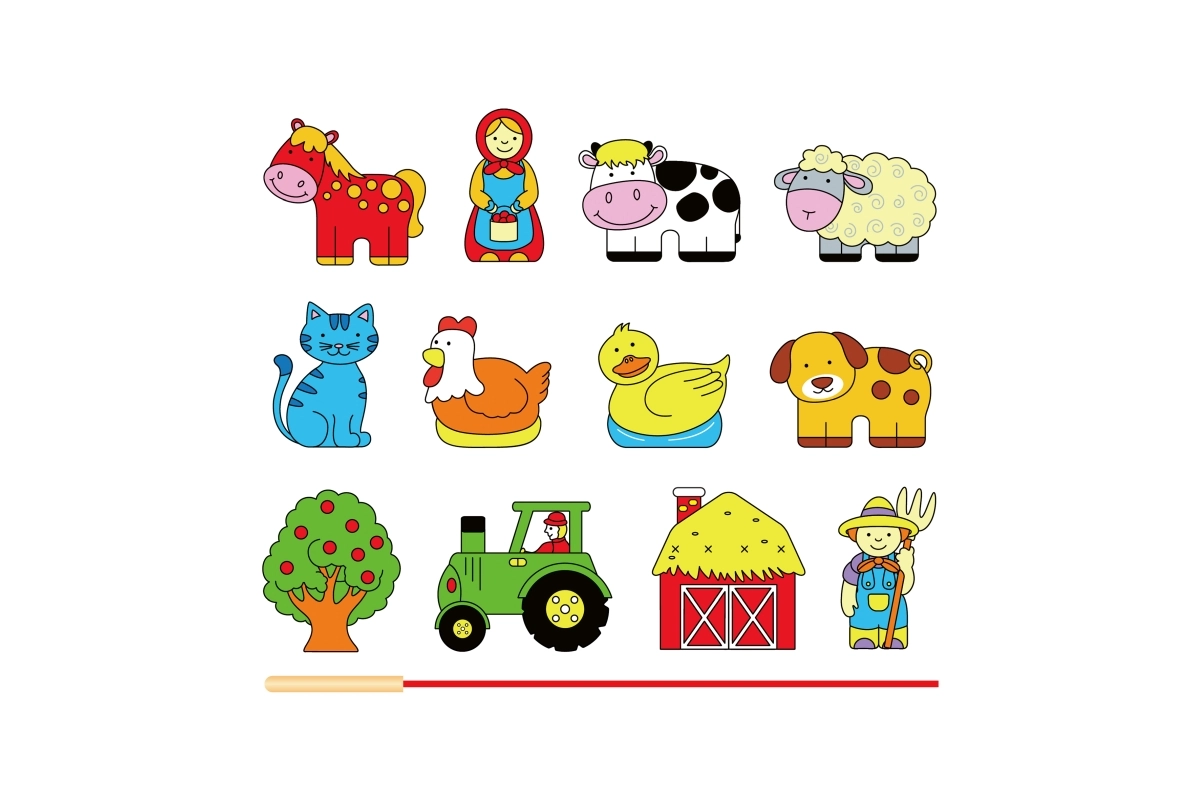 Kaladėlės vaizduoja įvairias ūkio formas, tokias kaip gyvūnai, traktorius, tvartas ir kt., skatinančias kūrybišką žaidimą ir pasakojimų kūrimą.
