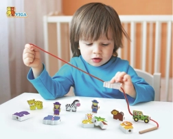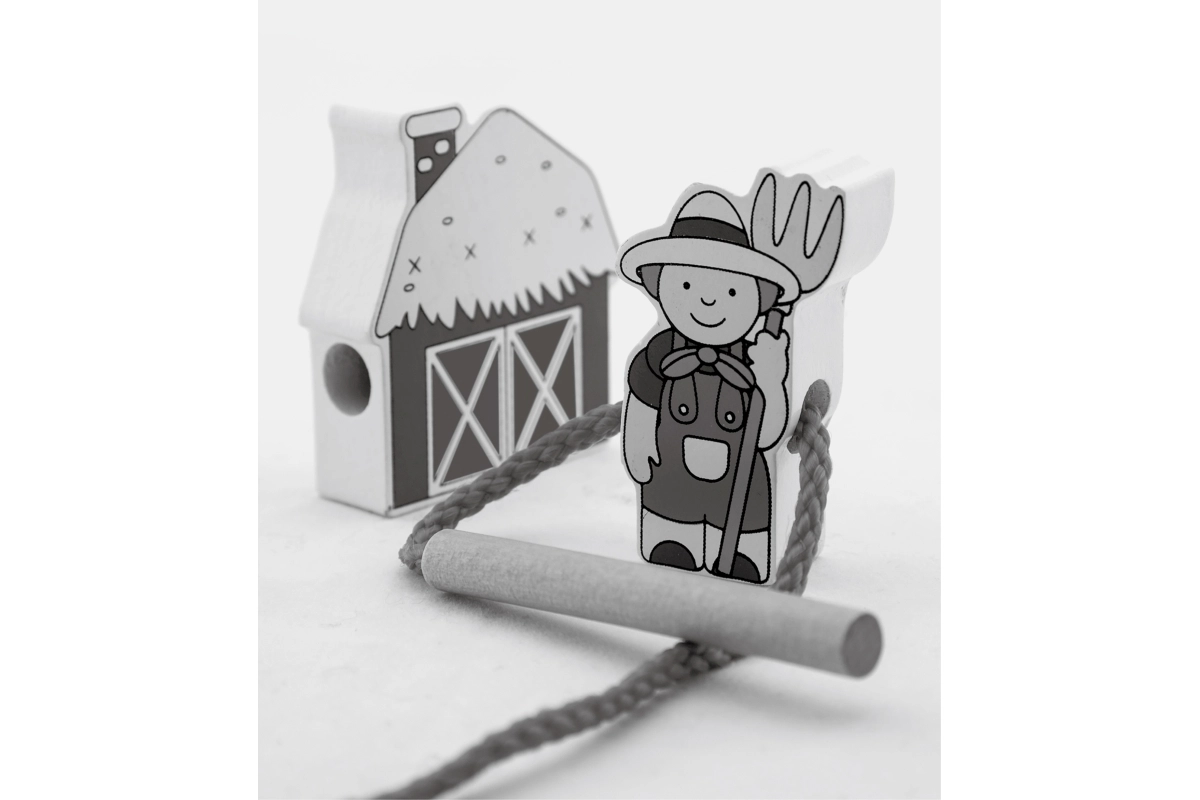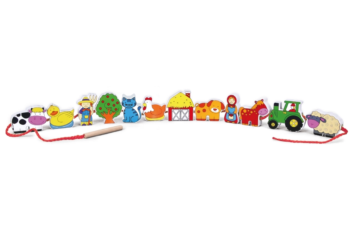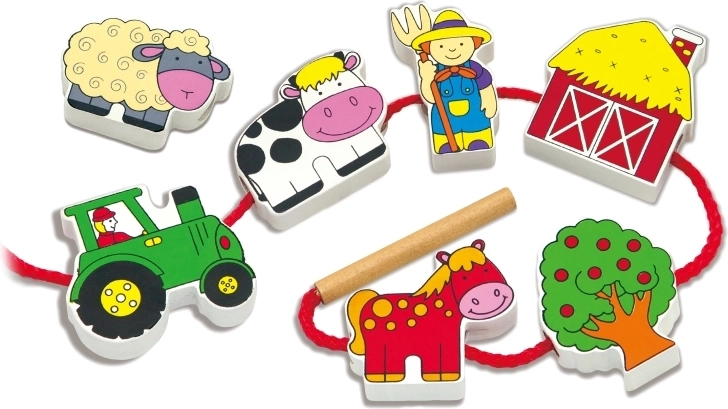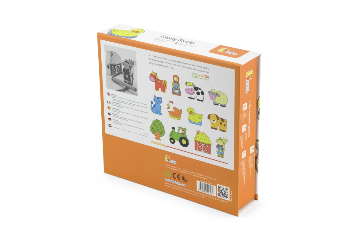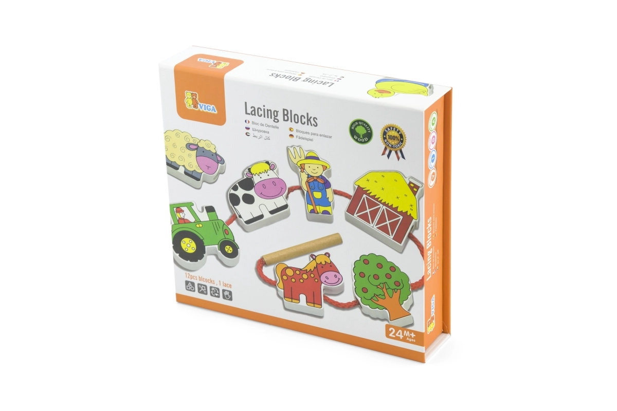 VIGA medinės veriamos ūkininko kaladėlės sukurtos taip, kad sudomintų kiekvieną vaiką. Šiame rinkinyje yra 12 spalvingų kaladėlių su ūkio motyvais, kurias vaikas gali suverti kartu, naudodamas pridėtą virvelę. Yra įvairių formų, tokių kaip karvė, antis, katinas, višta, šuo, arklys, avis, ūkininkas ir jo žmona, traktorius, tvartas ir obelis.