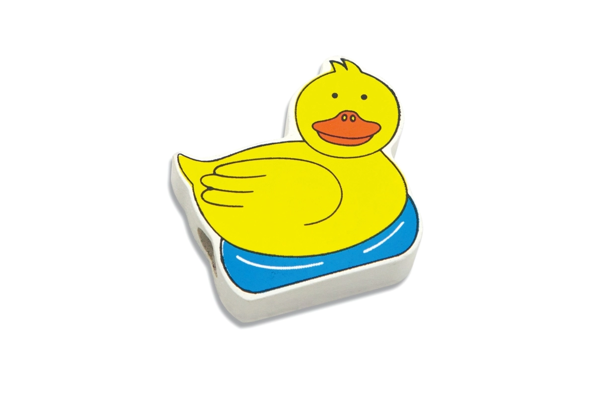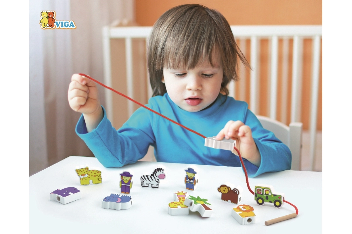 Rinkinyje yra spalvingos medinės kaladėlės ir virvelė, kurios moko vaikus vikrumo ir kantrybės veriant.
