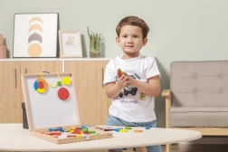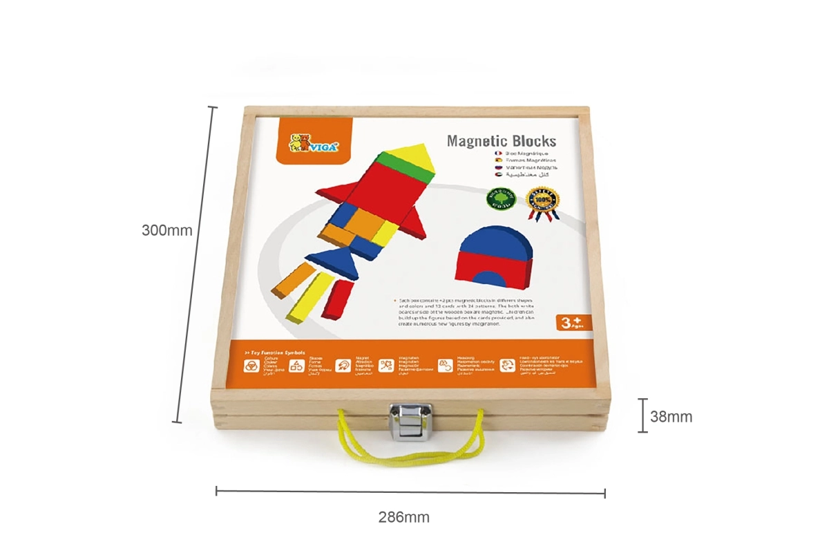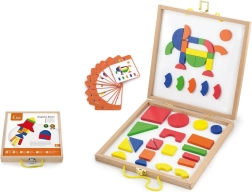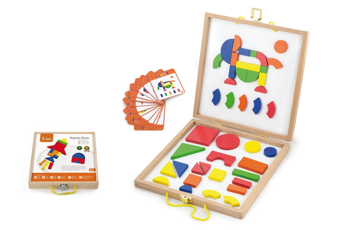 Rinkinyje yra 42 medinės magnetinės detalės įvairių formų ir spalvų bei 12 dvipusių kortelių su iš viso 24 išradingais pavyzdžiais lengvam startui. Žaisdami vaikai lavina smulkiąją motoriką, akių–rankų koordinaciją, spalvų ir formų suvokimą bei erdvinį mąstymą.