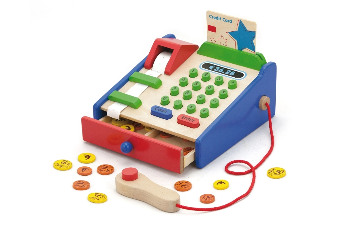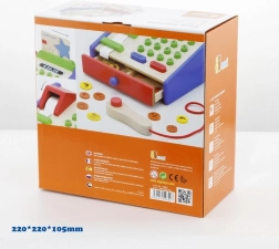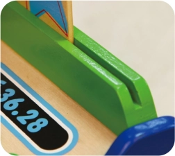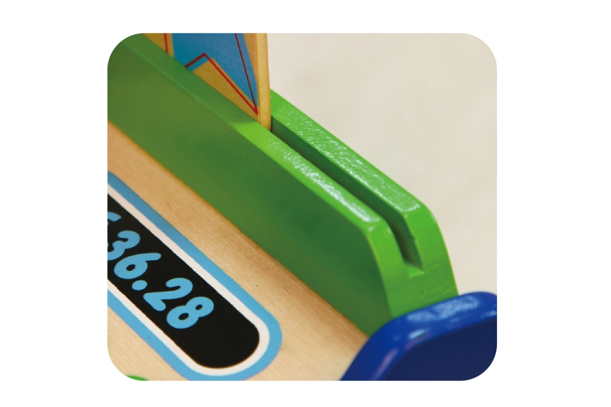 Ši spalvinga medinė vaikų kasos aparatūra suteikia realistišką apsipirkimo patirtį – mygtukų spaudimas, stalčiuko su „grynaisiais“ atidarymas, mokėjimas kortele ar skeneriu ir „kvitų“ spausdinimas. Dėl apgalvotų priedų vaikai lengvai lavina skaičiavimą, komunikaciją ir bendradarbiavimą.