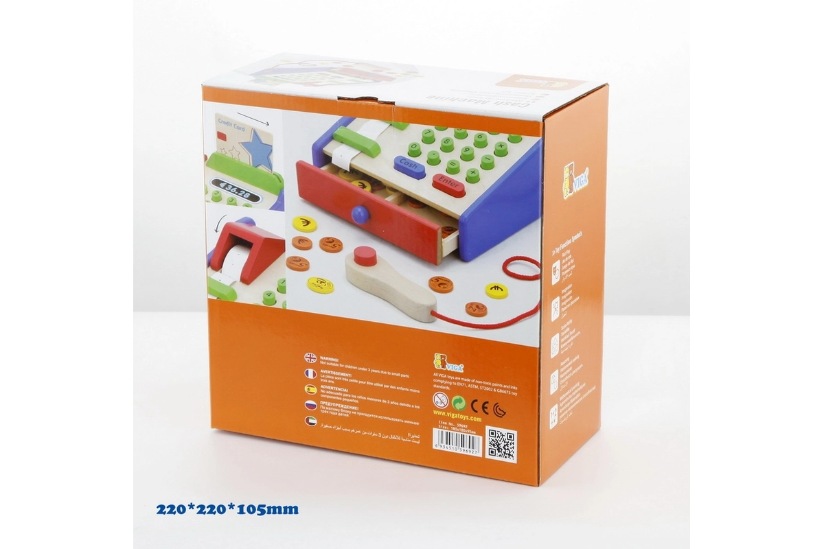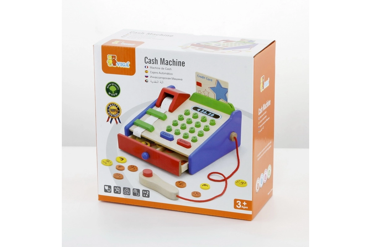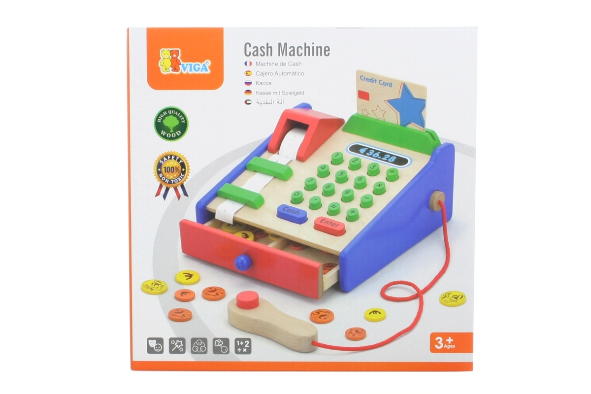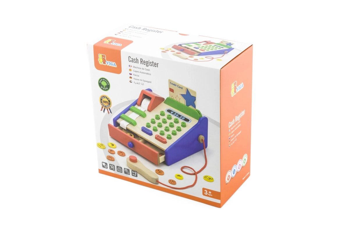 Suteikite vaikams linksmą prekybos žaidimą su kokybiška medine kasos aparatūra VIGA. Rinkinyje yra 40 monetų, mokėjimo kortelė, skeneris su virvele ir popieriaus ritinėlis „kvitams“. Viename žaisle skatinamas skaičiavimo mokymasis, socialiniai įgūdžiai ir Montessori principai.