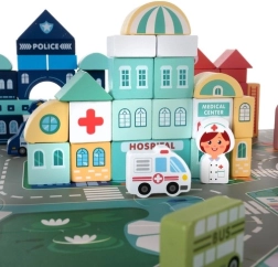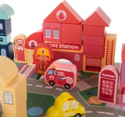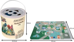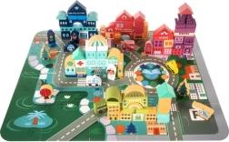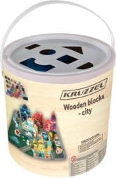Kruzzel medinės kaladėlės – tai galimybė vaikams lavinti kūrybinius gebėjimus ir kartu sužinoti daugiau apie miesto aplinką. Rinkinyje yra spalvingas žaidimų kilimėlis su keliais ir pastatais, suteikiantis puikias sąlygas įsivaizduojamam žaidimui.