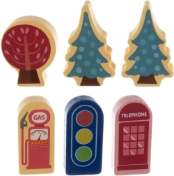 Taip pat yra priedų, tokių kaip medinės žmonių ir transporto priemonių figūrėlės bei dekoratyviniai elementai – medžiai ir gatvės detalės. Labai detalus dizainas suteikia žaidimui realistiškumo ir puikiai sudomina įvairaus amžiaus vaikus.
