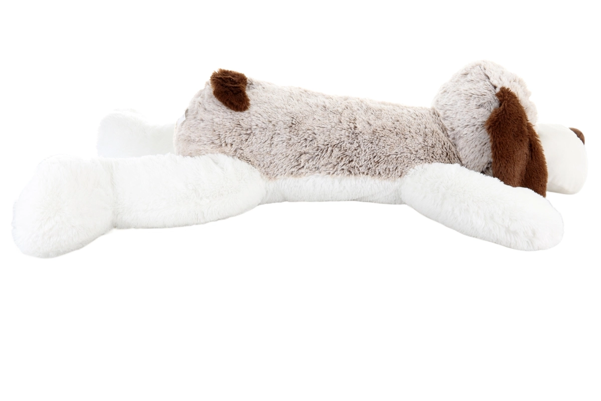 Šis didelis gulintis pliušinis šuniukas pradžiugins kiekvieną vaiką ir gyvūnų mylėtoją. Jis maloniai minkštas, švelnus liesti, o dėl 100 cm dydžio puikiai tinka kaip glostomas draugas, galvos pagalvėlė ar dekoratyvinis akcentas lovytei ar vaikų kampeliui. Kokybiškas apdirbimas ir subtilios detalės užtikrina saugų ir patogų žaidimą net patiems mažiausiems.