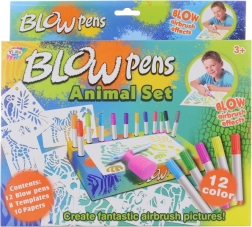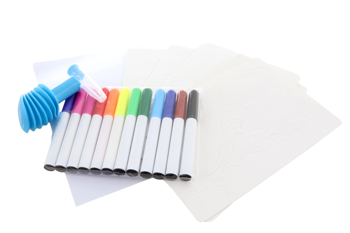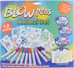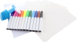 - 12 spalvotų flomasterių, 8 trafaretai, 6 lapai, kartoninis stovas su laikikliu, pučiamas antgalis su pompą