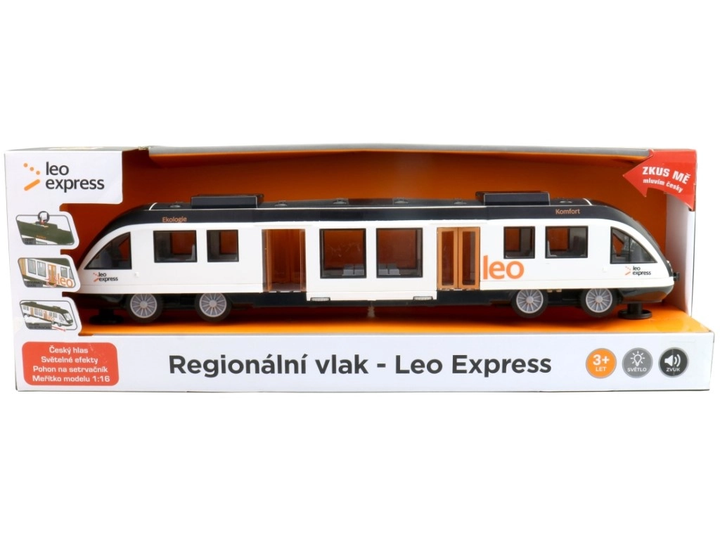 Leisk vaikams leistis į kelionę bėgiais su realistišku regioniniu traukiniu LEO EXPRESS. Žaislas siūlo čekų pranešimus, šviesos efektus ir inercinę pavarą sklandžiam važiavimui be bėgių. Į komplektą įeina AG13 baterijos, tad galima žaisti iš karto. Tinka vaikams nuo 3 metų.
