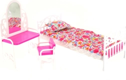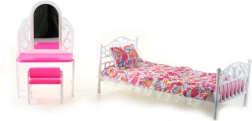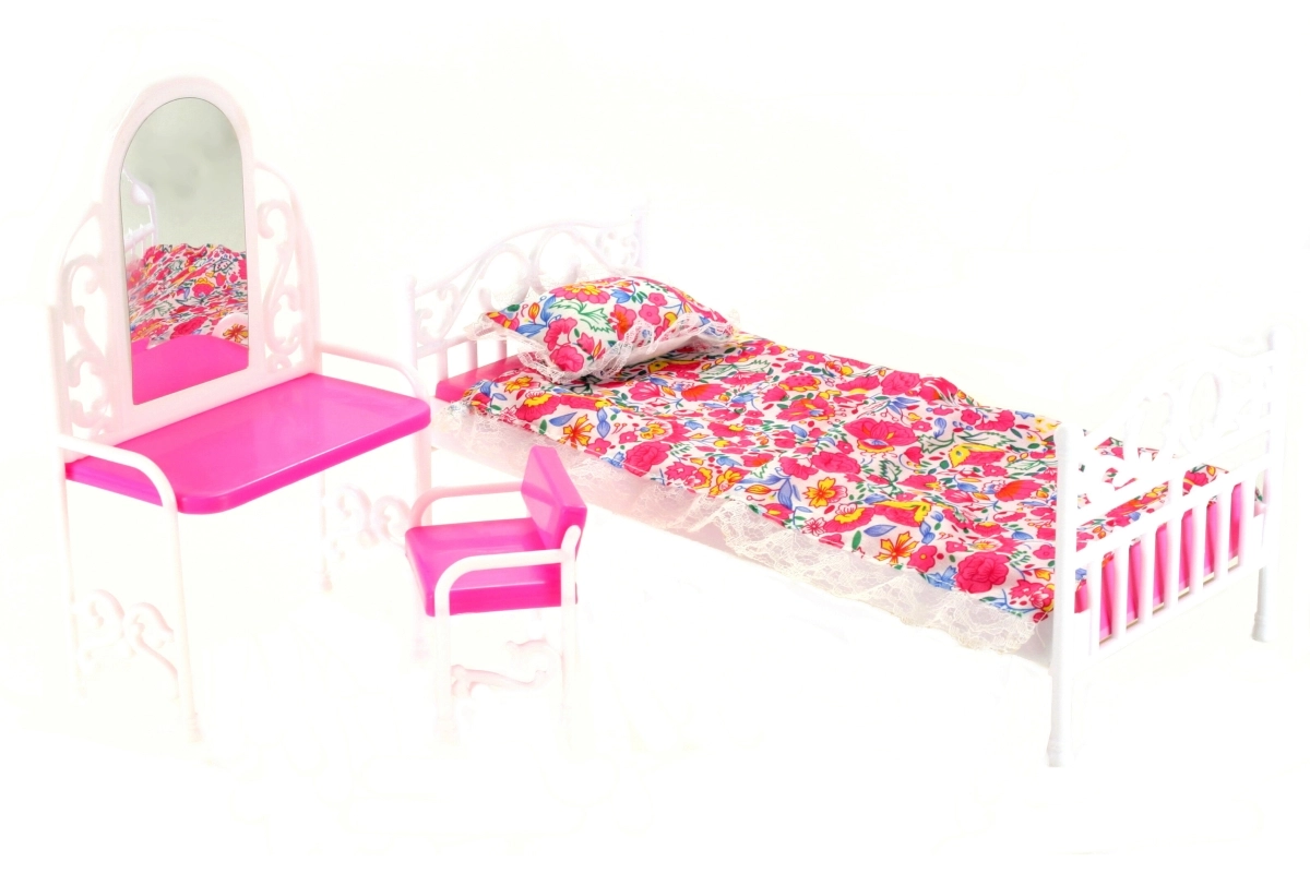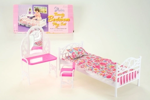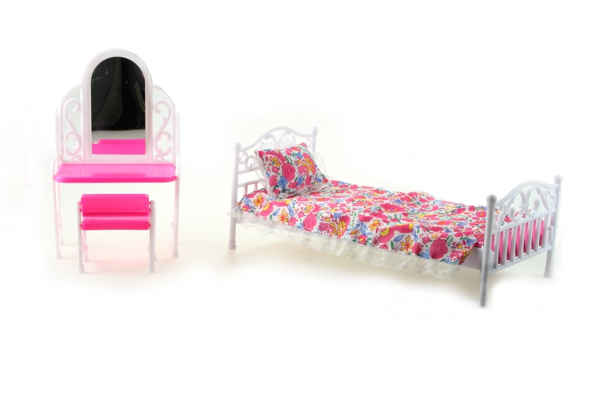 Atraskite žavų „Glorie“ rinkinį, kuris apima lėlės lovą su minkštu užtiesalu ir pagalvėle, tualetinį staliuką su veidrodine plėvele ir praktišką kėdutę. Puikiai tinka daugumai įprastų lėlių ir suteiks jų kambariui jaukią vietą poilsiui ir pasipuošimui.