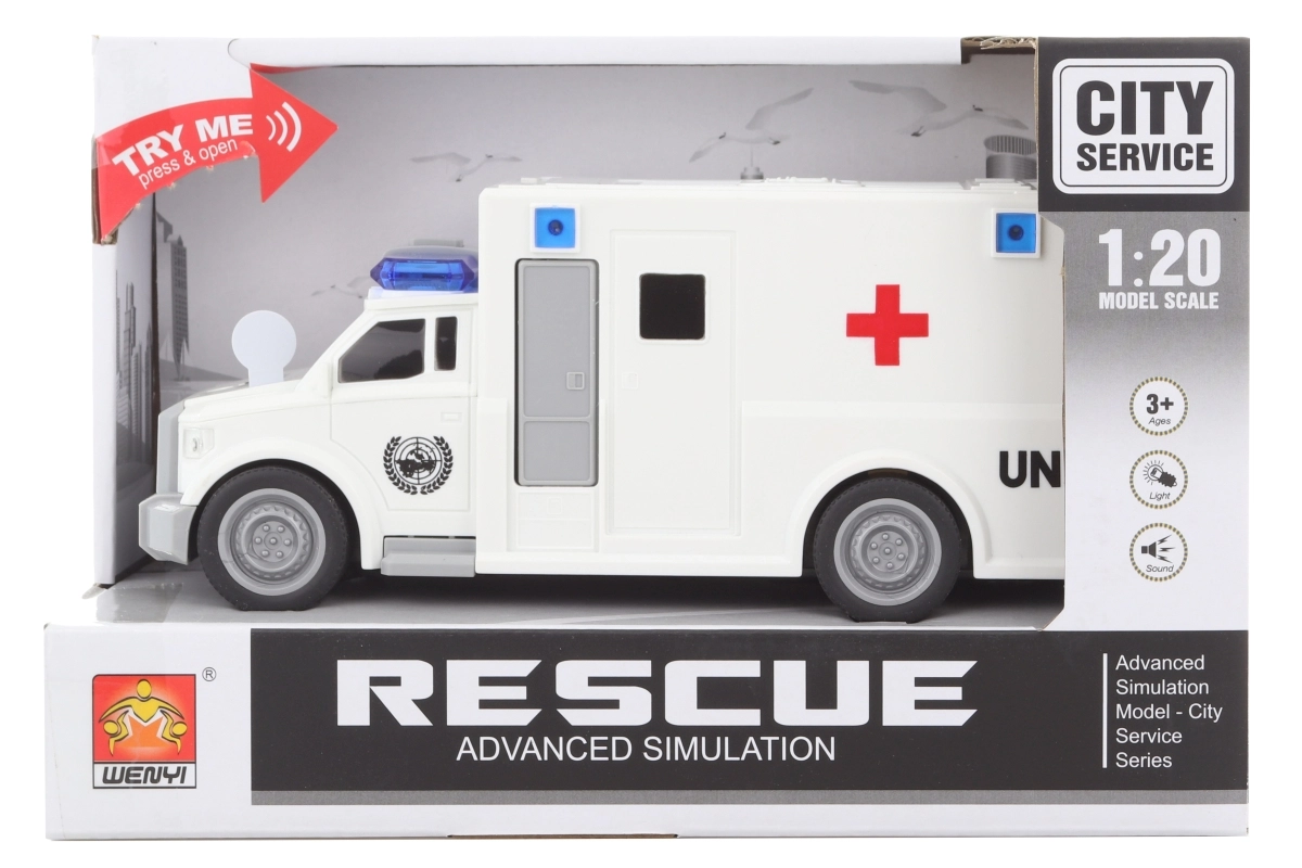 Realistiška plastikinė greitosios pagalbos mašina su baterijomis pradžiugins mažus gelbėtojus. Paspaudus mygtukus ant stogo ji šviečia ir leidžia garsus, turi atidaromas duris ir yra pasirengusi veiksmui. Komplekte yra 3 AG13 baterijos.