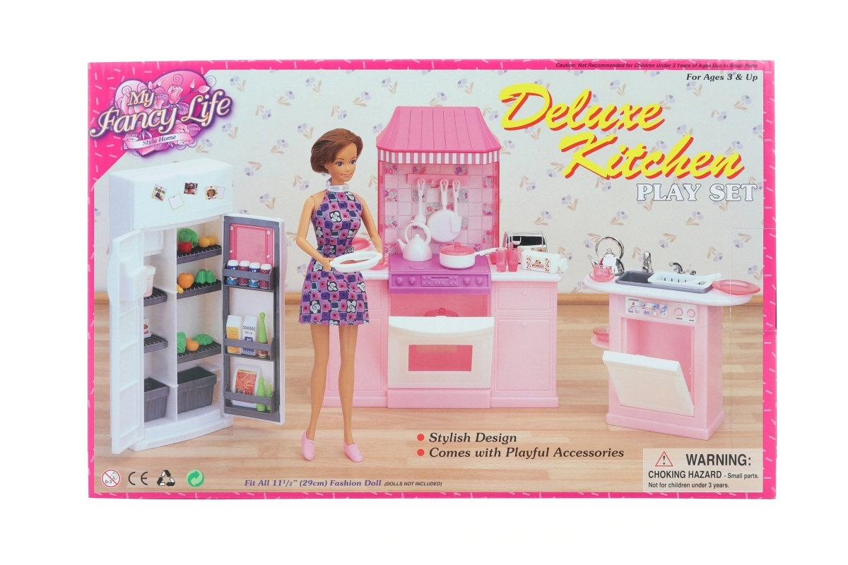 Rinkinys pagamintas iš patvaraus plastiko ir turi įvairių indų priedų, todėl galima iš karto „gaminti“. Idealiai tinka daugumai įprastų lėlių. Lėlė neįtraukta.