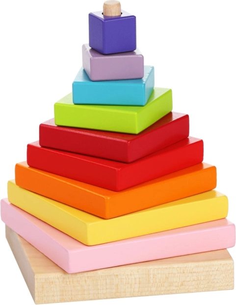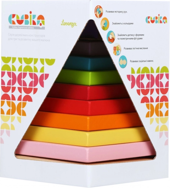 Prekės ženklas Cubika siūlo ekologiškus medinius žaislus su precizišku apdirbimu ir patraukliu dizainu. Spalvota piramidė – tai iš 9 dalių sudaryta dėlionė, kurią galima sudėti į piramidės formą. Šis žaislas ne tik smagiai lavina jutimo-motorinius įgūdžius, bet ir loginį mąstymą bei kūrybiškumą.