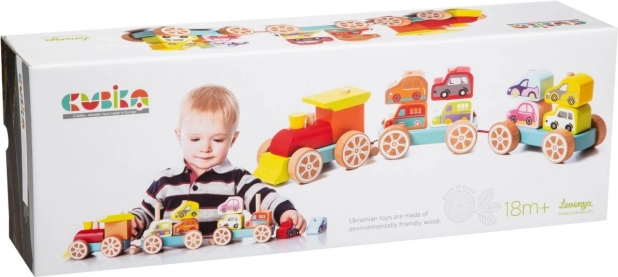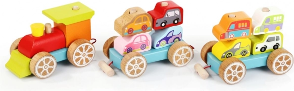 Ši spalvinga medinė dėlionė turi 14 detalių, iš kurių vaikai gali surinkti traukinuką su dviem vagonais ir aštuoniais automobiliukais. Žaisdami jie ne tik dėlioja atskiras dalis, bet ir lavina savo sensomotorinius gebėjimus, loginį mąstymą ir kūrybiškumą.