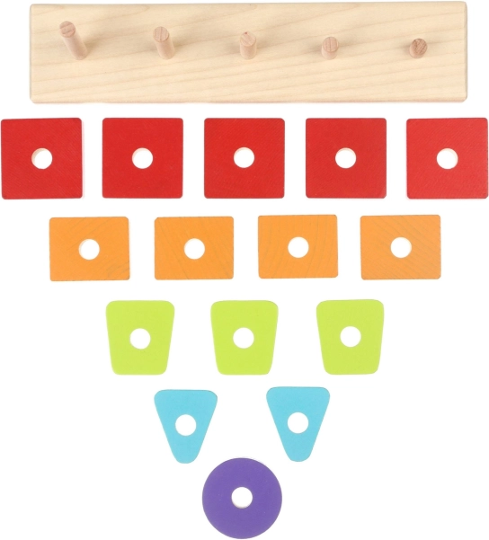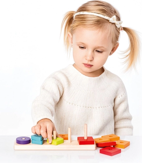 Dėl skirtingų geometrinių detalių ir besikartojančių spalvų vaikai lengvai įsisavina rūšiavimą, poravimą ir teisingą uždėjimą ant pagrindo kuolelių.