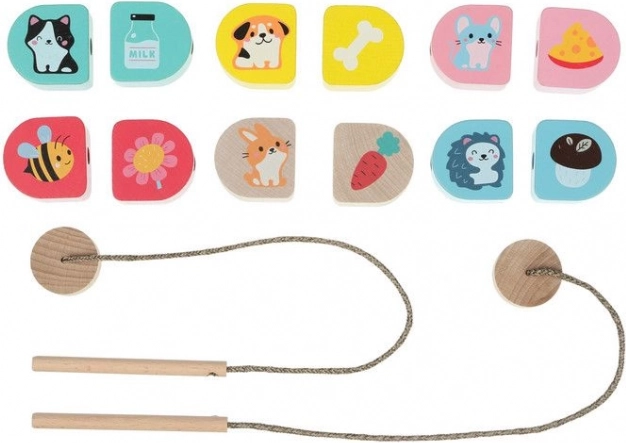 12 medinių veriamosios dėlionės detalių (6 poros), 2 virvelės su mediniu smeigtuku ir fiksatoriumi