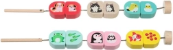 Medinių detalių verimas lengvesnis dėl pagaliuko ant virvelės. Vaikai lavina suėmimą, tikslumą ir kantrybę dėliodami gyvūnų poras.