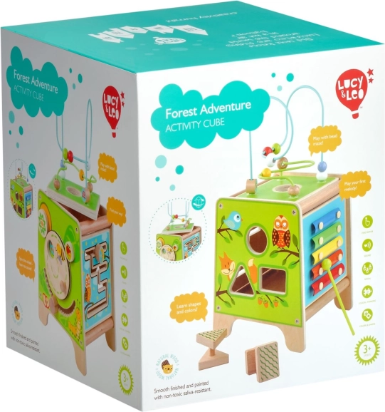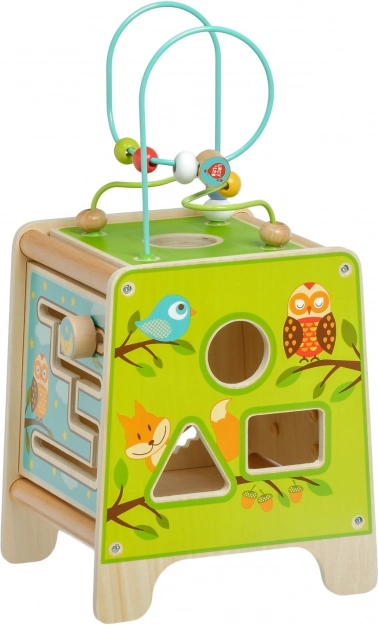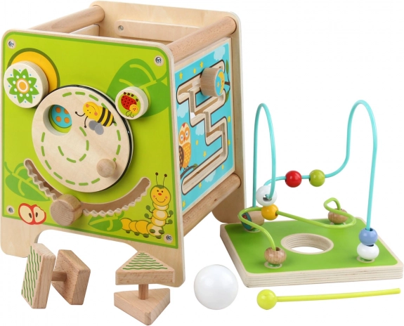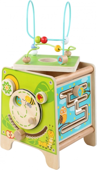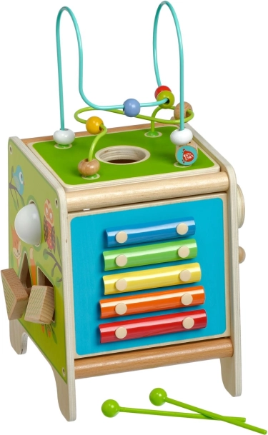 Šis spalvingas medinis aktyvus kubas suteikia vaikams valandų valandas prasmingo žaidimo. Viršuje esantį karoliukų labirintą galima išimti ir apversti į kubo vidų patogiam laikymui. Ant šonų vaikai ras ksilofoną su plaktukais, dviejų dalių sukamų geometrinių formų dėliojimą, motorinį labirintą, besisukantį ratuką, pasukamus elementus ir linksmą žaidimą su slankiojančiu kaišteliu griovelio takeliu.