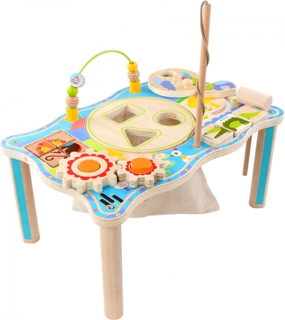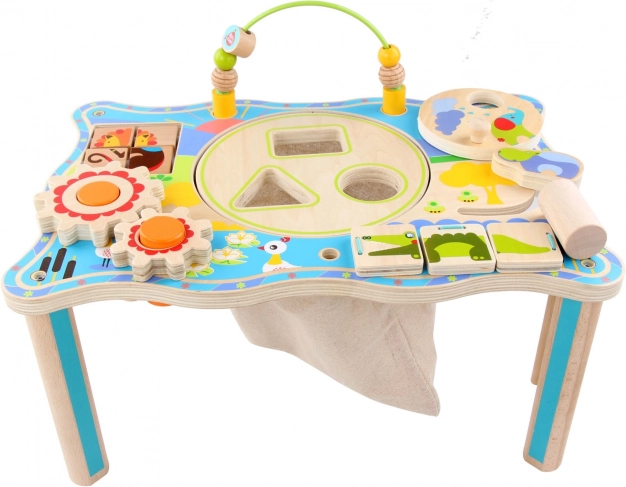 Medinis staliukas su džiunglių motyvais jungia pramogą ir mokymąsi, skatina smulkiąją motoriką, akių–rankų koordinaciją ir loginį mąstymą. Vaikai gali sukti dantračius, stumdyti karoliukus bėgeliu, lavinti jėgą ir susikaupimą su kaladėle-kalimo žaidimu bei mokytis atpažinti formas naudojant rūšiuoklę. Centre yra lininis maišelis pagautoms žuvytėms ir žaidimų detalėms, kuris padeda išlaikyti tvarkingą žaidimų paviršių.