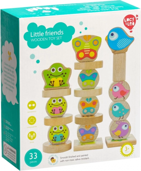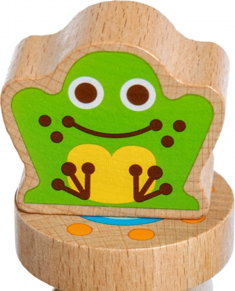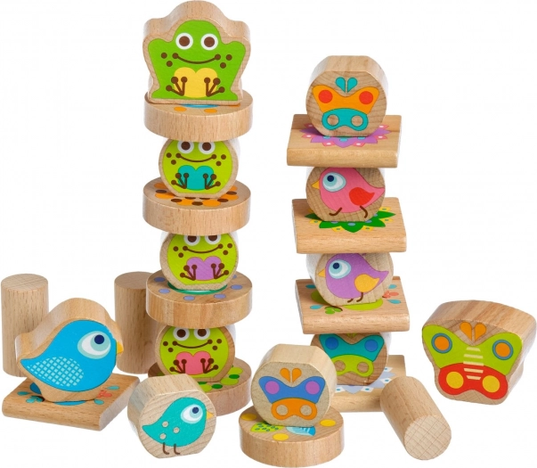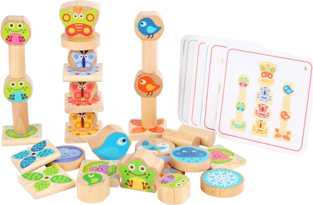 Atraskite linksmą medinį pusiausvyros žaidimą vaikams su varlyčių, paukštelių ir drugelių motyvais. Rinkinyje yra 33 detalės ir dvipusės kortelės su šablonais, kurios lavina smulkiąją motoriką, akių–rankų koordinaciją, kantrybę ir kūrybiškumą. Kokybiški mediniai blokeliai su užapvalintais kraštais yra saugūs mažoms vaikų rankoms ir telpa į patogų lininį maišelį kelionėms.