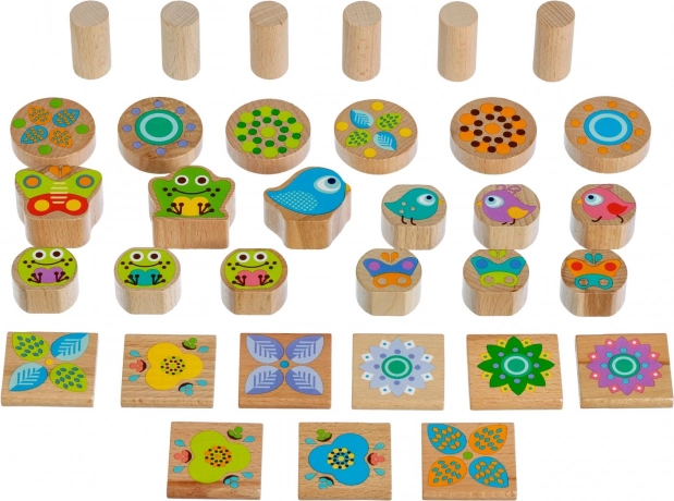 - 33 medinės detalės su spalvingomis varlyčių, paukštelių ir drugelių iliustracijomis.