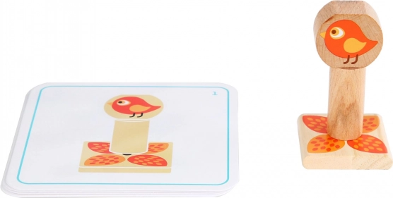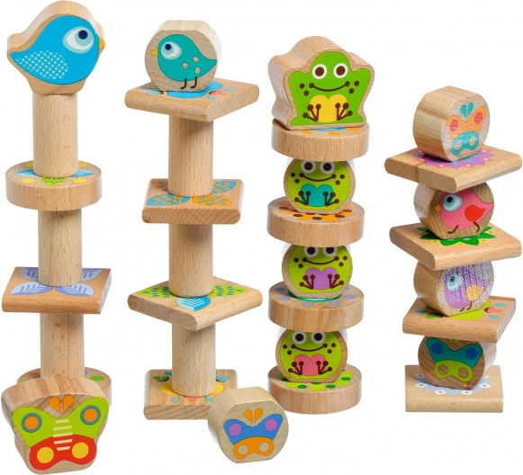 Blokeliai pagaminti iš patvarios medienos, turi glotnius, užapvalintus kraštus ir maloniai laikosi rankoje. Žaidimas skatina susikaupimą, loginį mąstymą ir formų atskyrimą, o vaikai treniruoja kantrybę ir tikslumą statydami stabilias bokštus ir raštus.