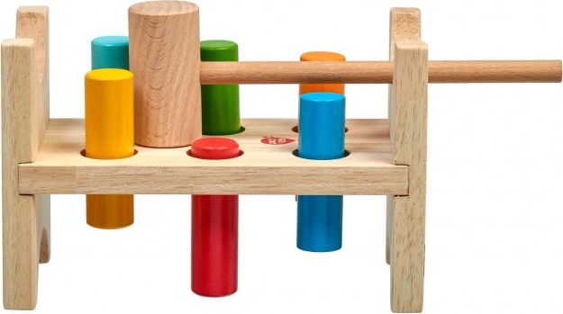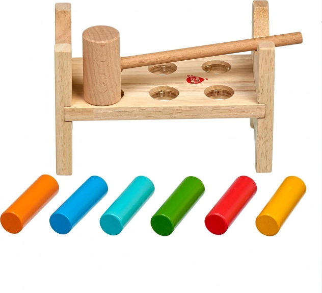 Šeši spalvoti kaiščiai ir medinis plaktukas moko vaikus tikslaus suėmimo, smūgio jėgos ir rankos–akies koordinacijos.