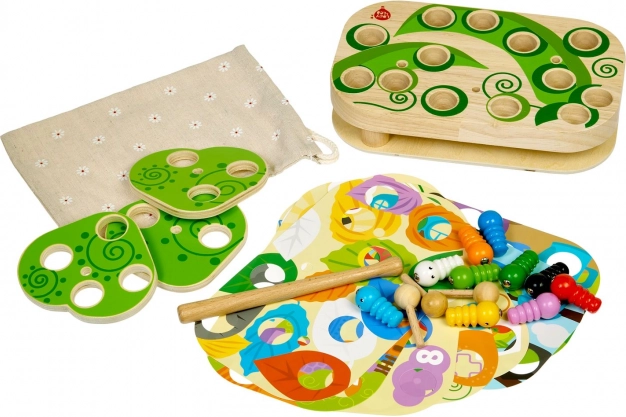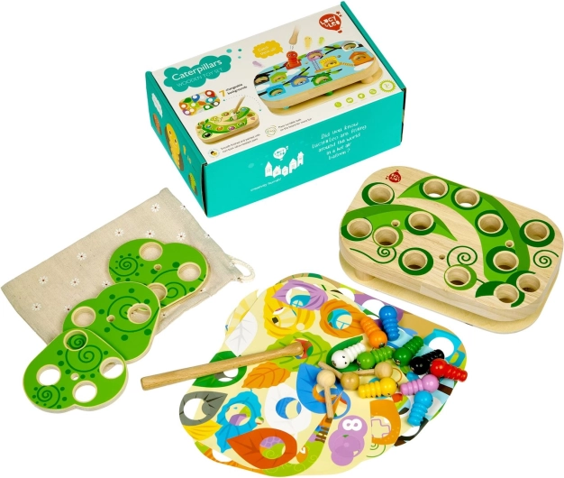 Linksmas ir edukacinis žaidimas Lucy & Leo vikšrų gaudymas lavina smulkiąją motoriką, loginį mąstymą ir akies–rankenos koordinaciją. Naudodami magnetinę lazdelę vaikai gaudo spalvingus vikšrus į angas medinėje lentoje ir išbando skirtingus sudėtingumo lygius su keičiamosiomis kortelėmis ir sukamais lapais.
