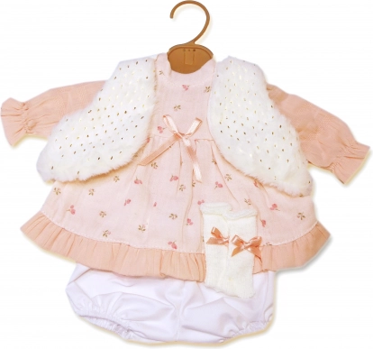 • Pilnas aprangos komplektas 42 cm lėlei: suknelė, liemenė ir kelnaitės